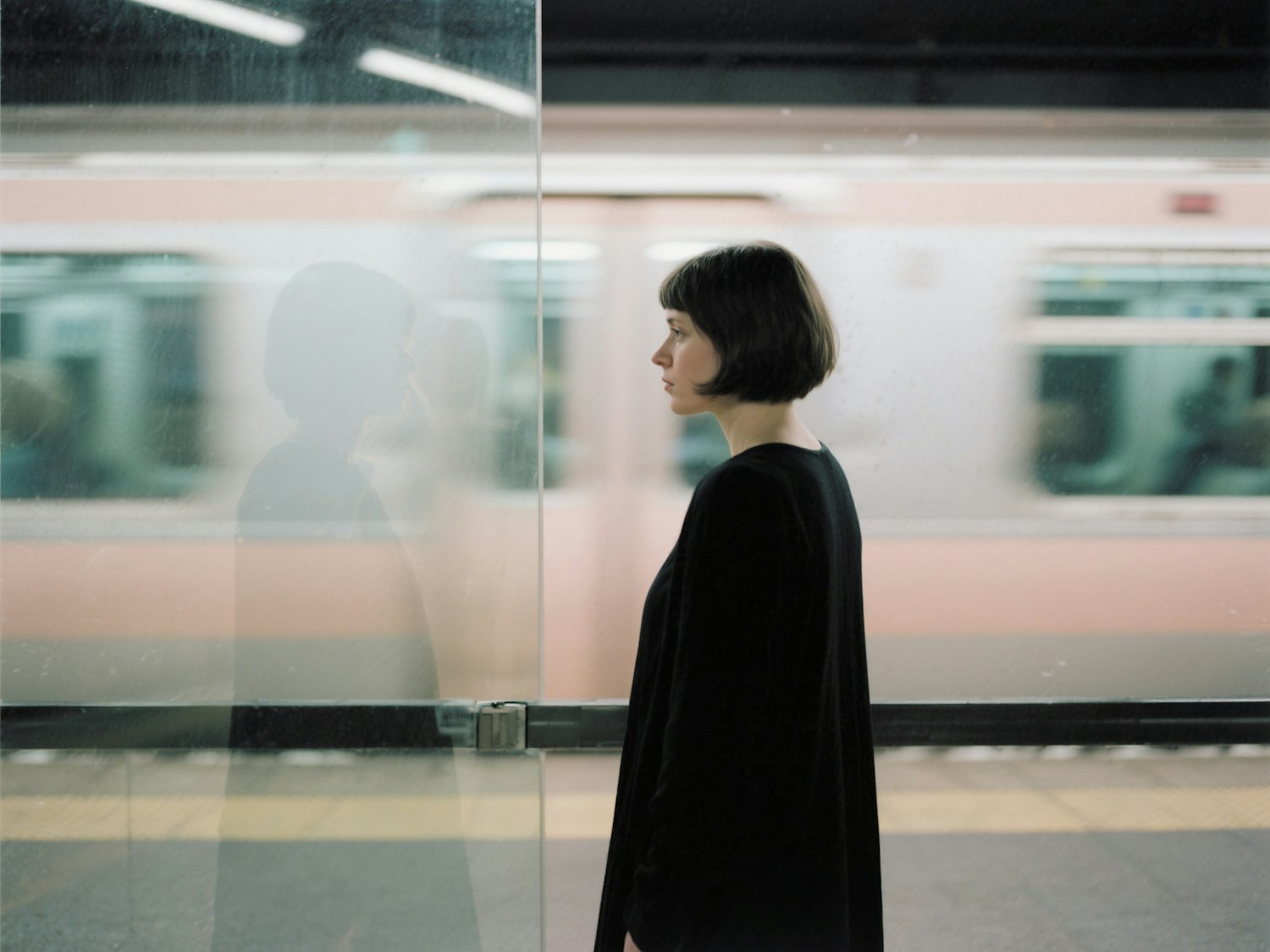 A woman stands by a glass panel in a subway station, her reflection visible as a pink train passes by in the background.