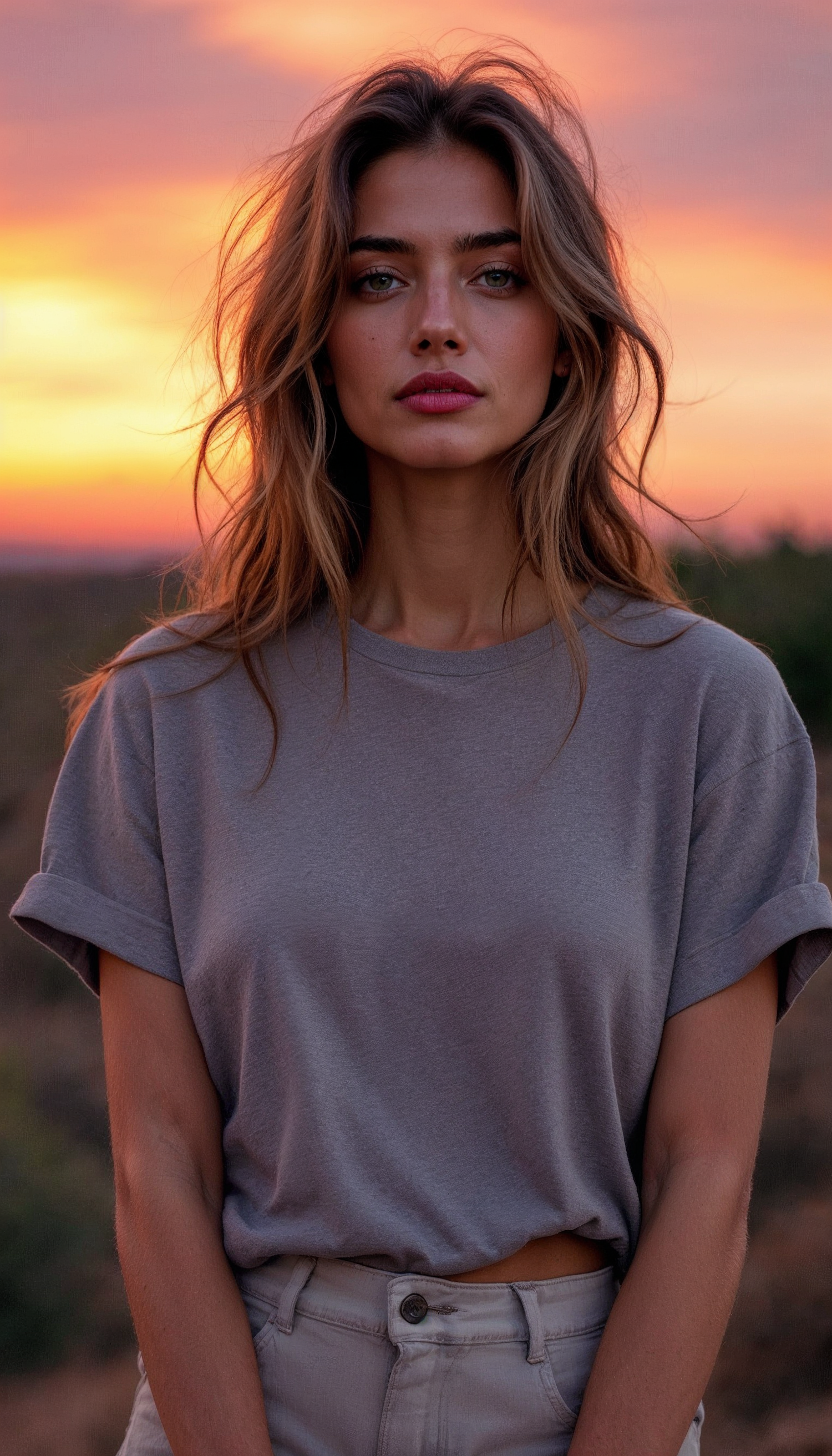 Young woman with wavy brown hair and green eyes stands against a vibrant sunset, wearing a gray t-shirt and light pants.