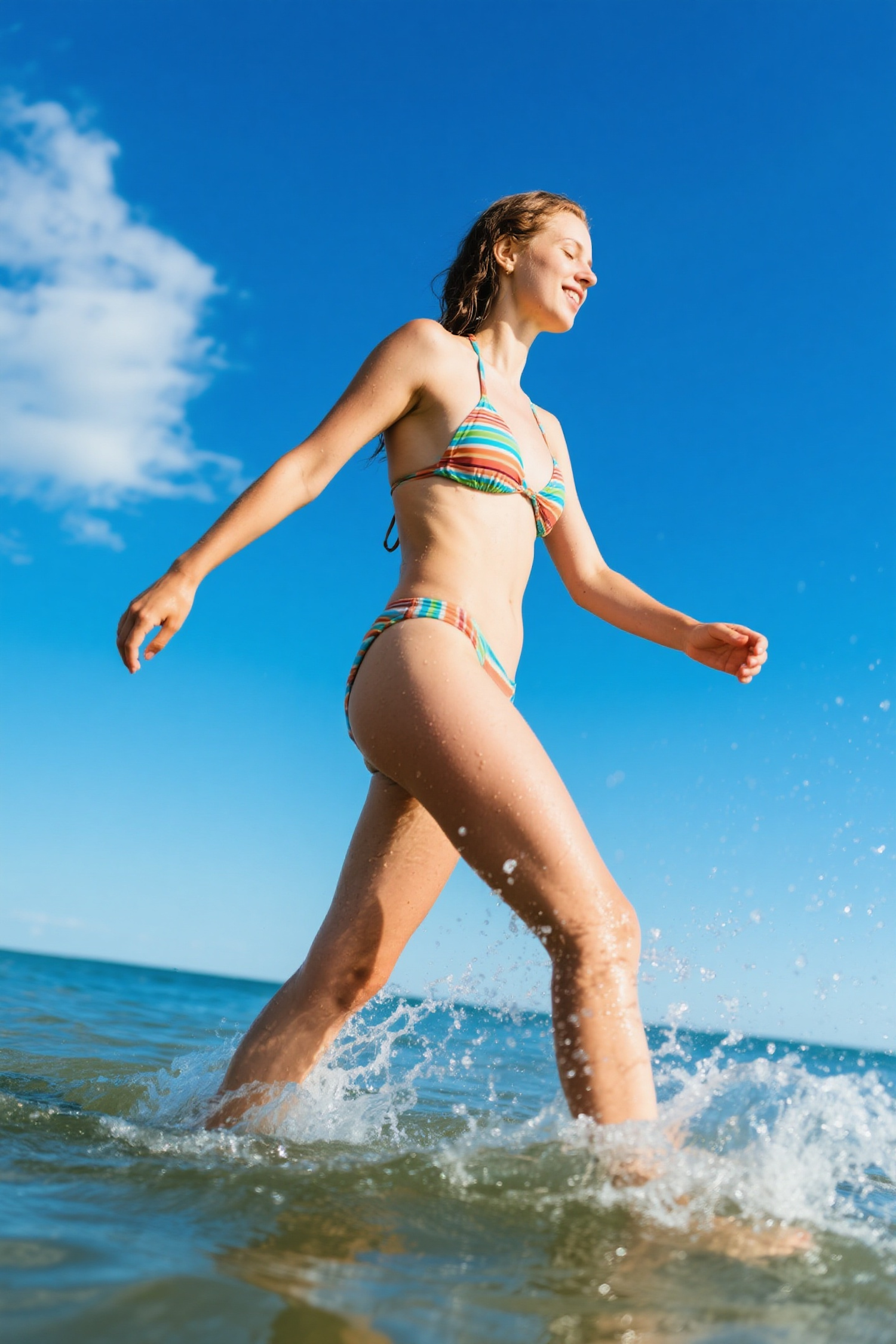 Woman in a colorful bikini walking through shallow ocean water under a bright blue sky, enjoying a sunny day at the beach.