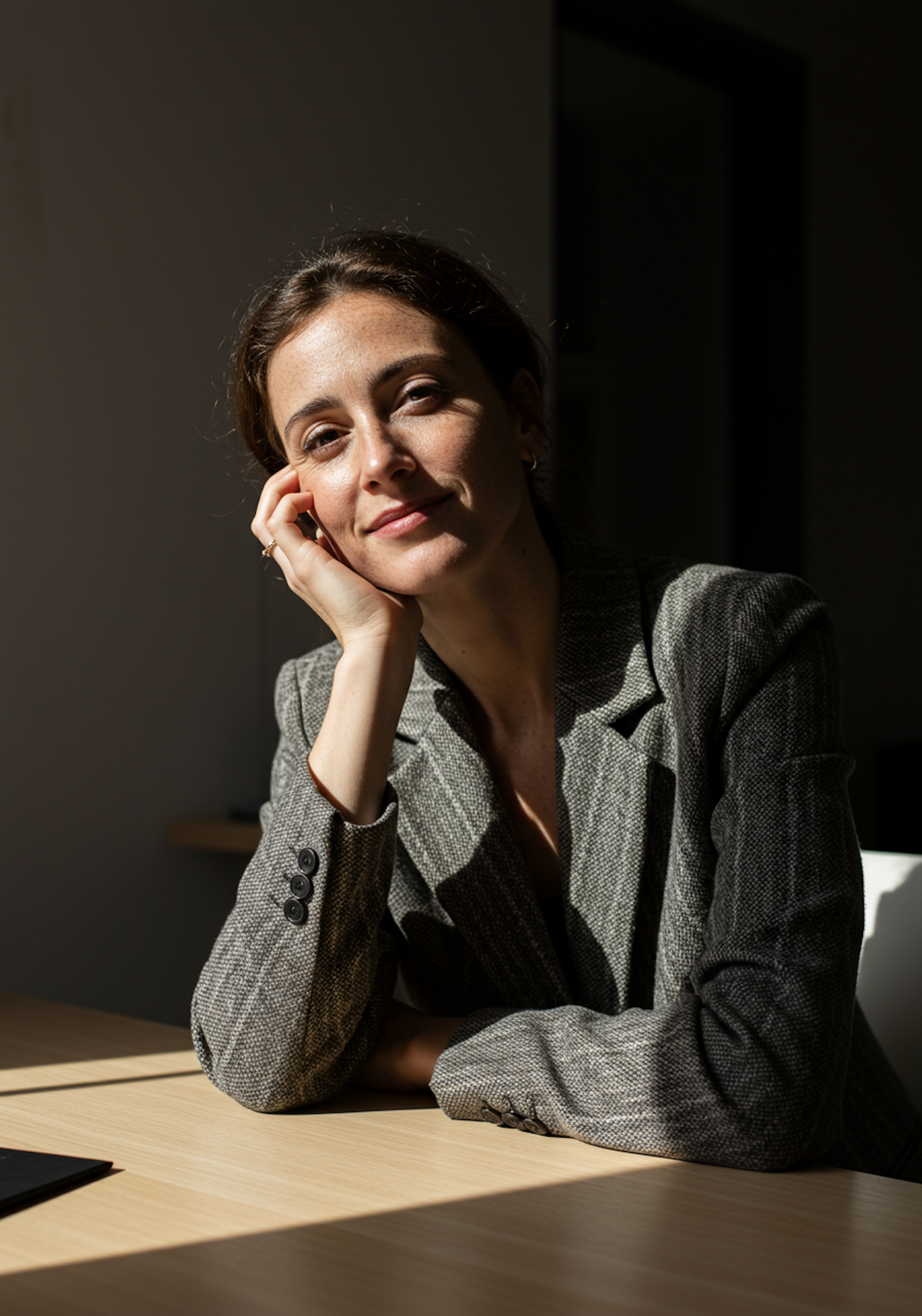 A woman in a gray blazer sits at a desk, resting her head on her hand, with sunlight casting soft shadows on her face.
