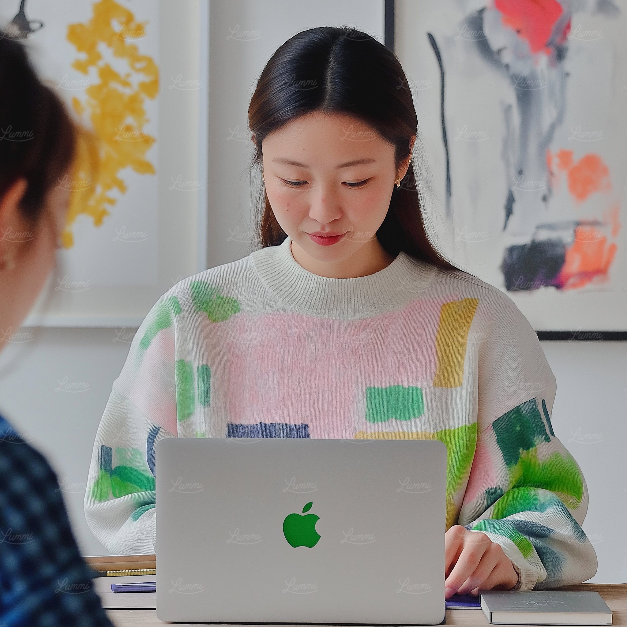 A woman in a colorful sweater works on a laptop with a green Apple logo, set against a backdrop of abstract art and a cozy workspace.