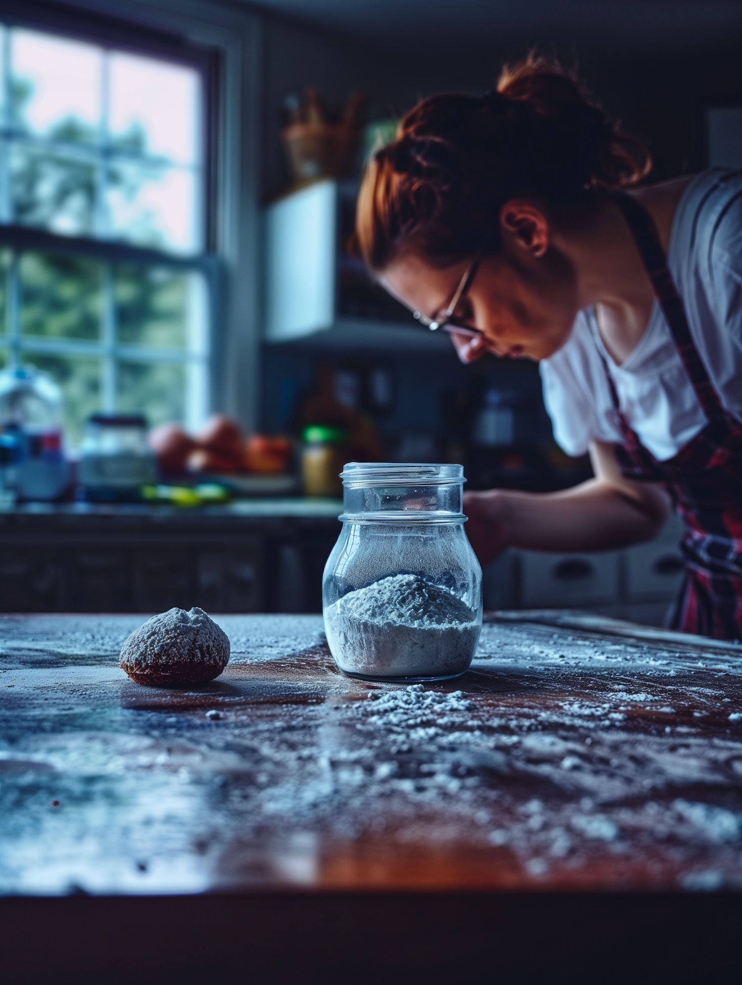 Woman in a kitchen with flour jar and dough ball on a wooden table, creating a cozy baking scene.