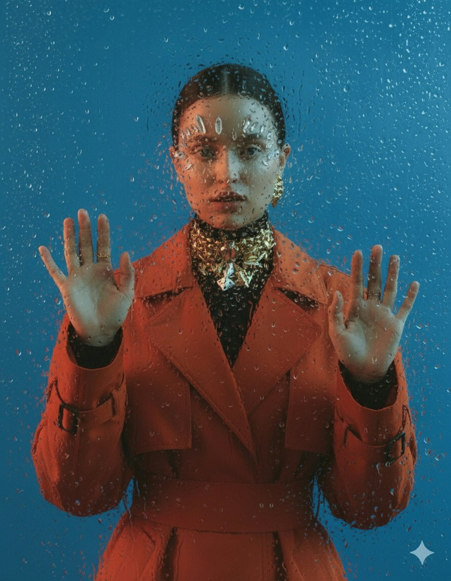 A woman in an orange coat stands behind a water-covered glass pane, creating a striking contrast with the blue background.