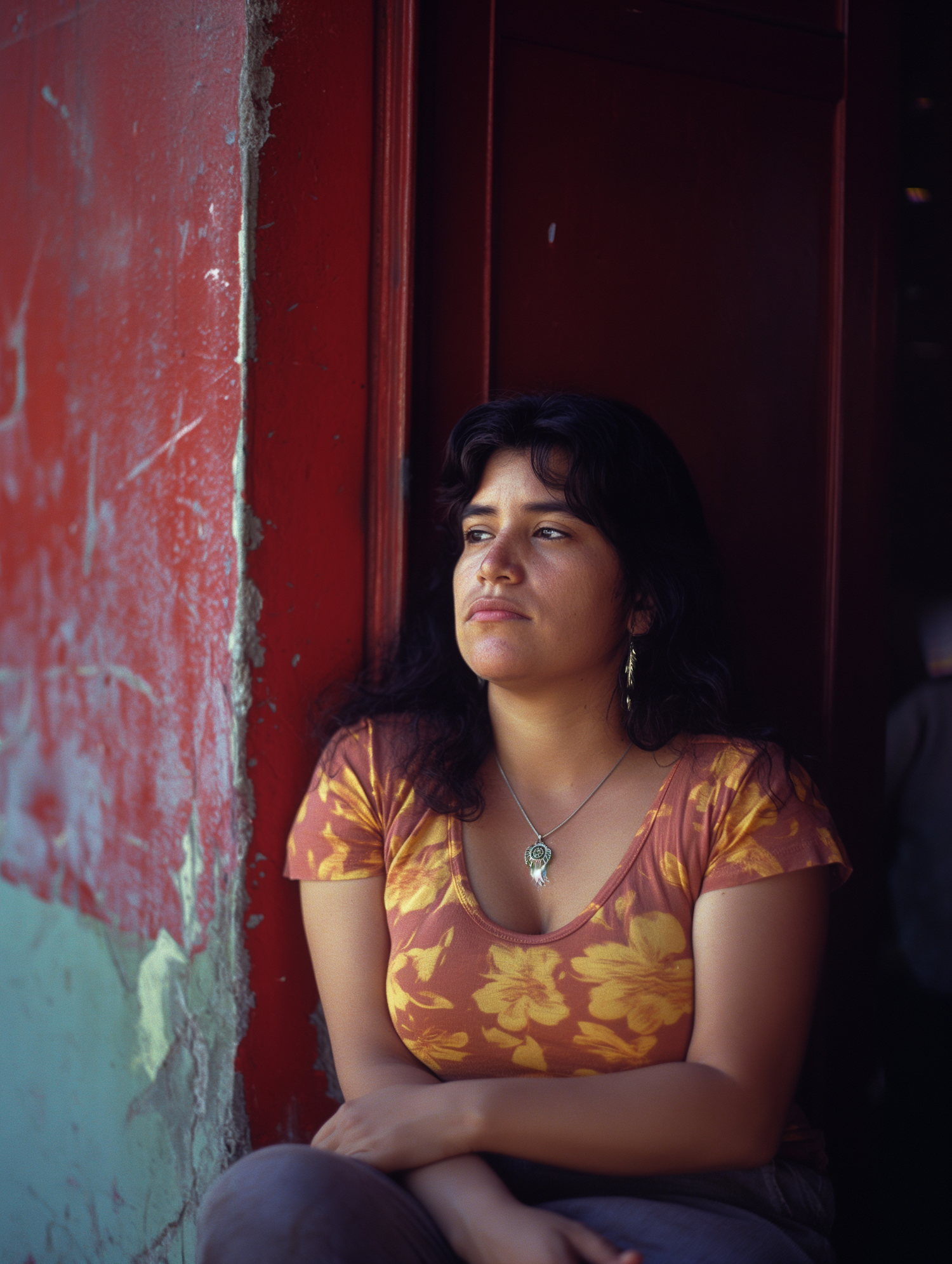 Woman in orange floral shirt sits against a red wall, face blurred, wearing a silver necklace. Rustic setting with warm lighting.