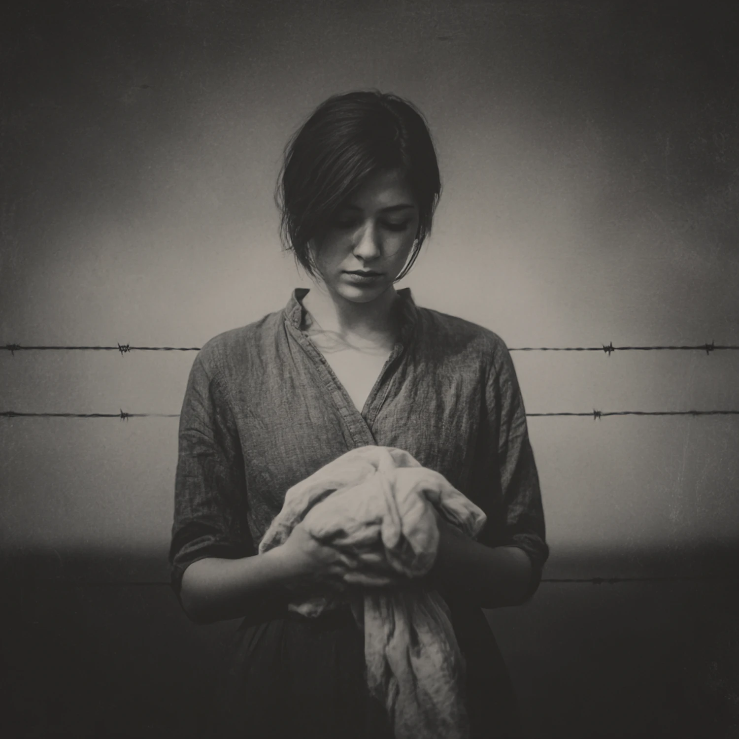 A monochrome portrait of a woman holding a cloth, standing solemnly in front of a barbed wire fence.