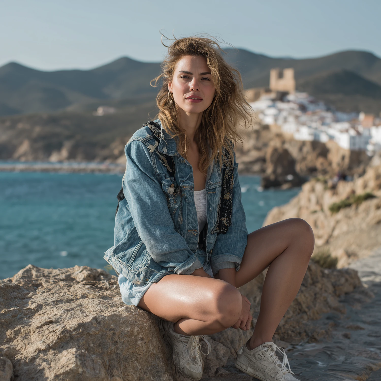 Woman in denim jacket sitting on rocks by the sea, with a coastal village and mountains in the background.