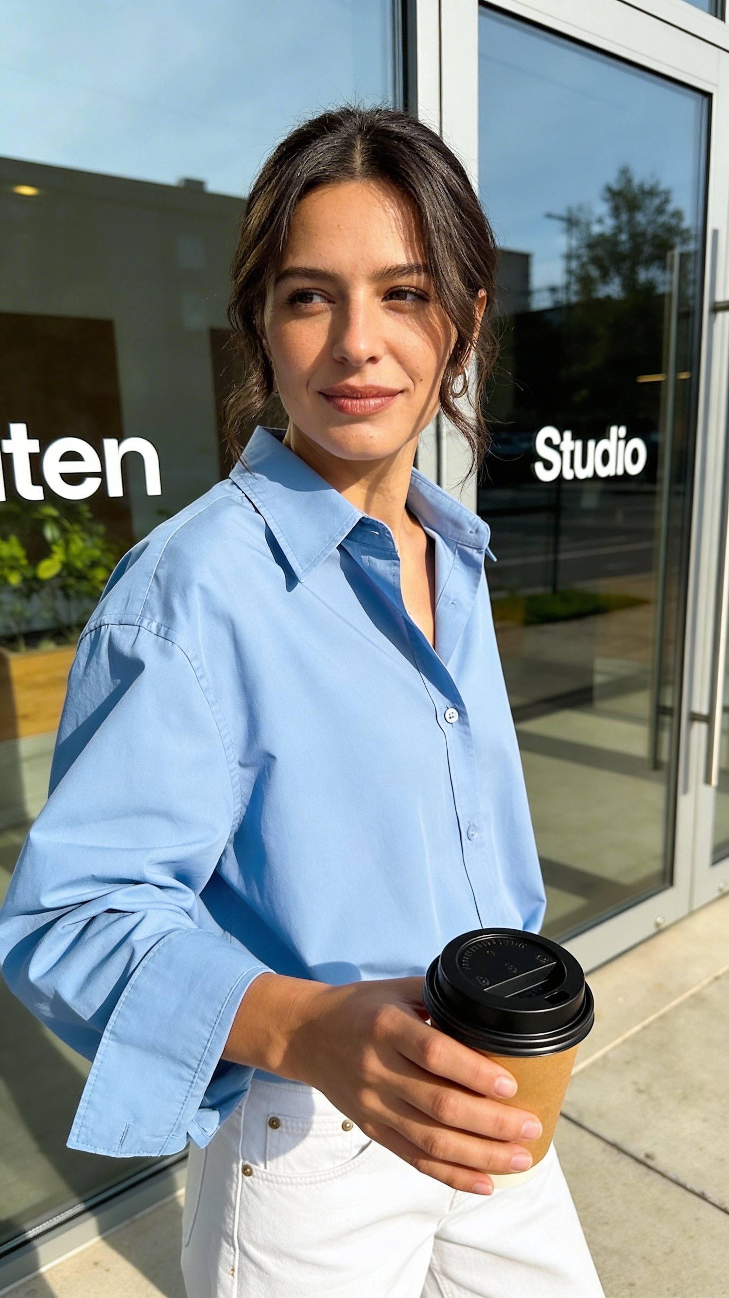 A woman in a blue shirt and white pants holds a coffee cup outside a studio, with sunlight highlighting her features.