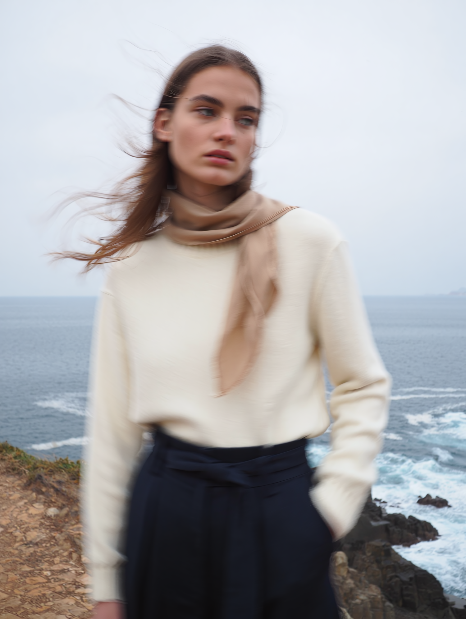 A woman in a cream sweater and beige scarf stands by a rocky coastline, with waves and an overcast sky creating a serene backdrop.