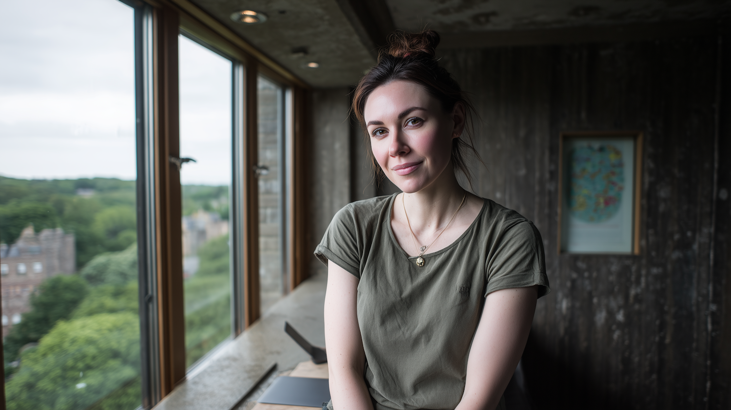 A woman in a green shirt sits by a window with a scenic view of greenery and buildings, framed by a rustic interior.
