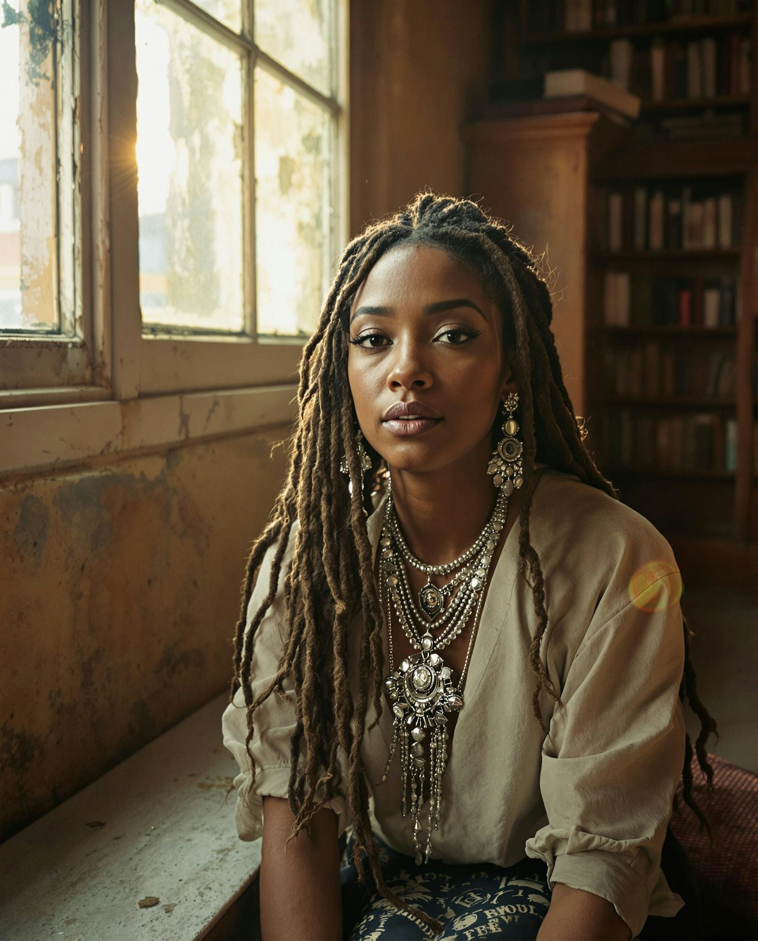 A young woman with long dreadlocks and ornate silver jewelry sits by a sunlit window, exuding warmth and elegance in a rustic setting.