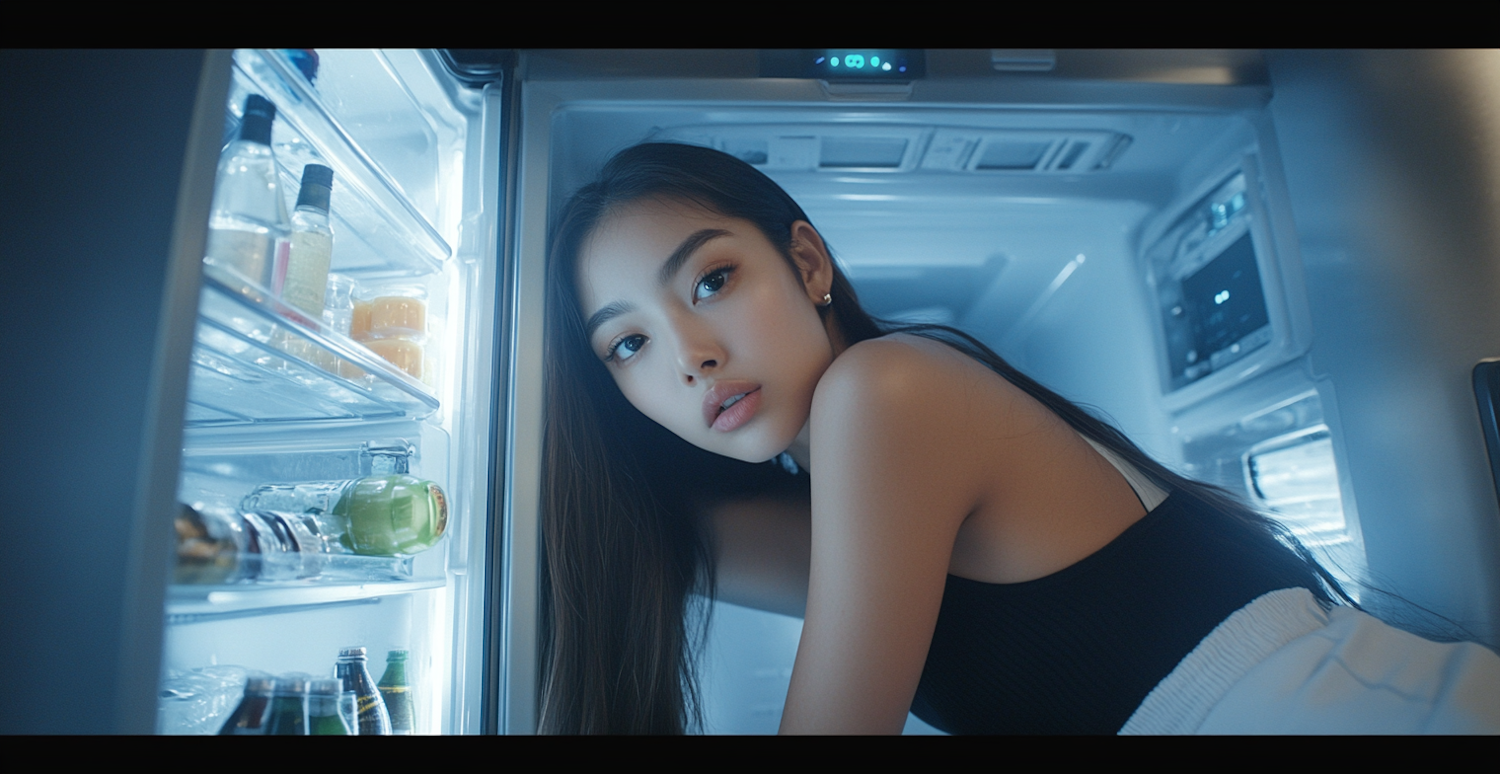 Asian woman with long black hair looks into a fridge, illuminated by cool blue light, wearing a black top and white pants.