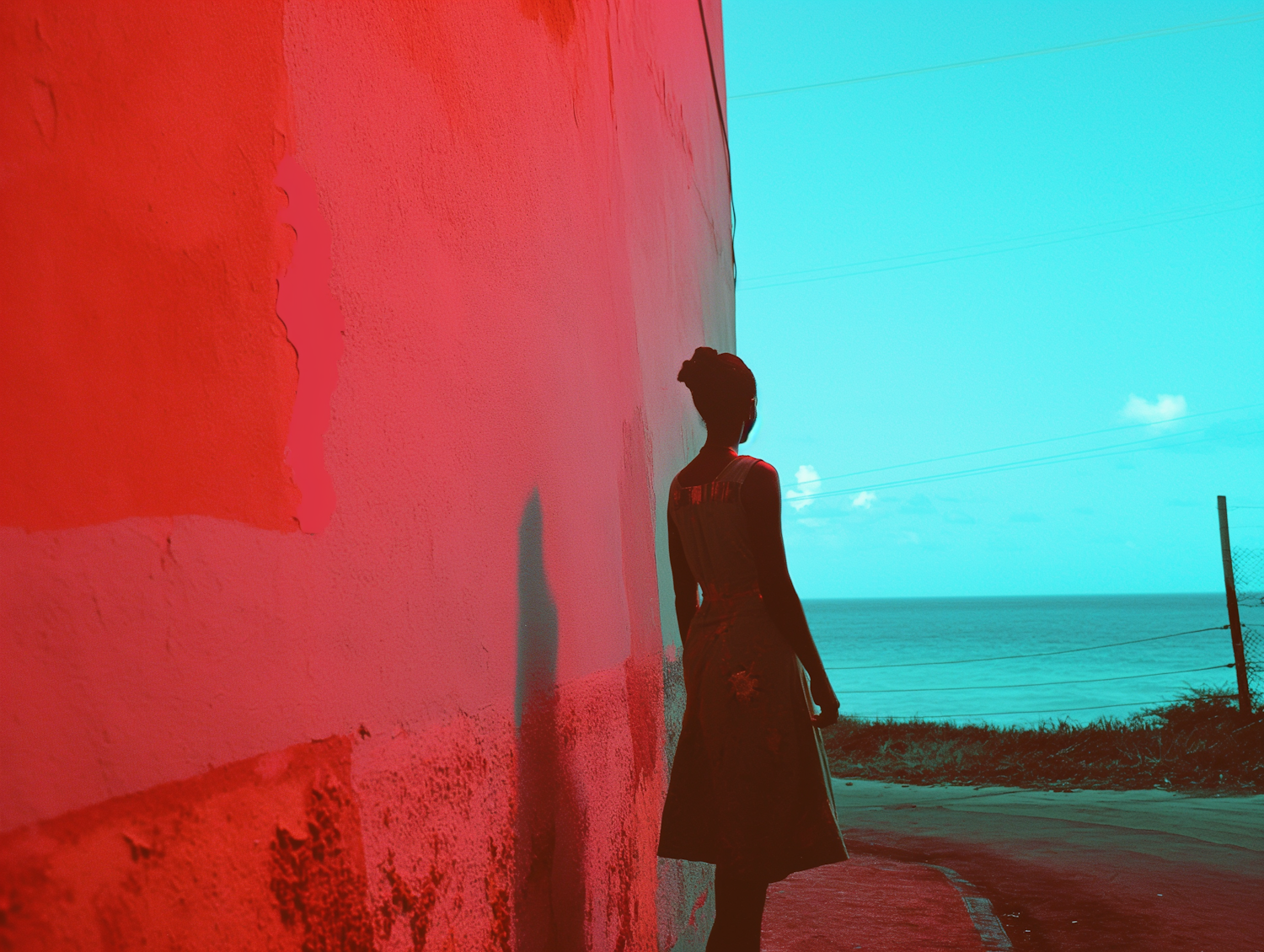 Silhouette of a woman against a red wall, gazing at a cyan-tinted ocean. Striking color contrast creates a surreal atmosphere.