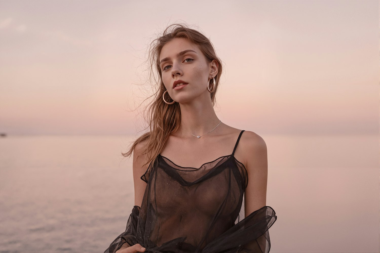 Young woman in a sheer black dress by the sea at sunset, with pastel sky and calm water, exuding elegance and tranquility.