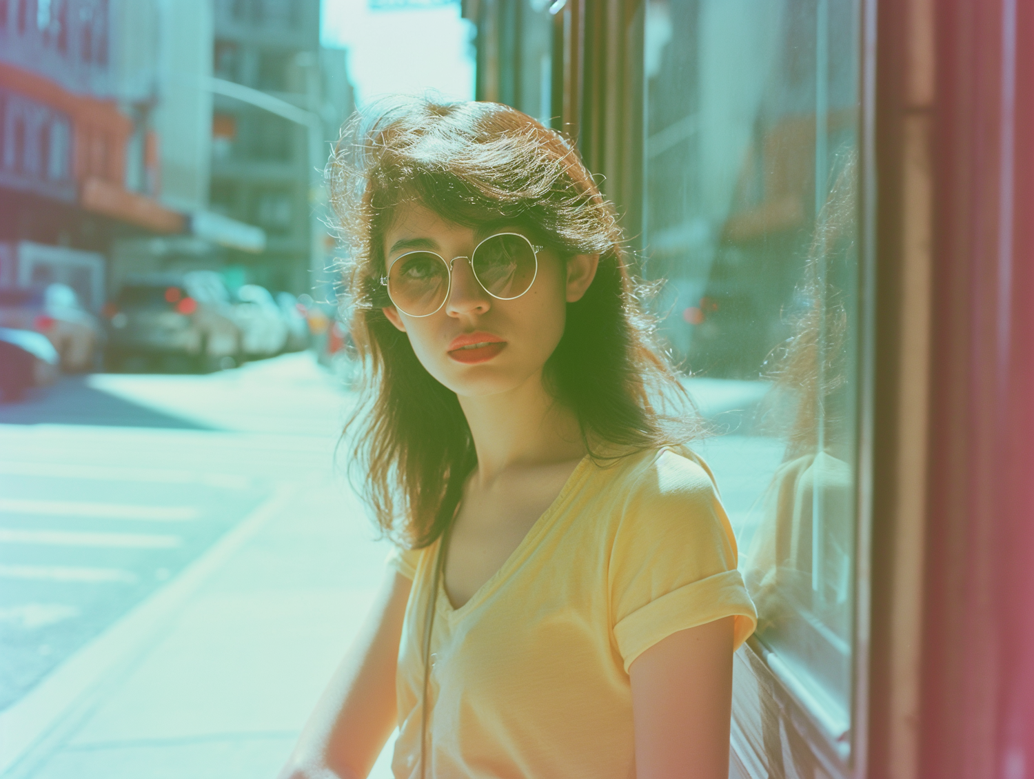Stylish woman in yellow t-shirt and round sunglasses in a vibrant urban setting with a retro, colorful overlay.