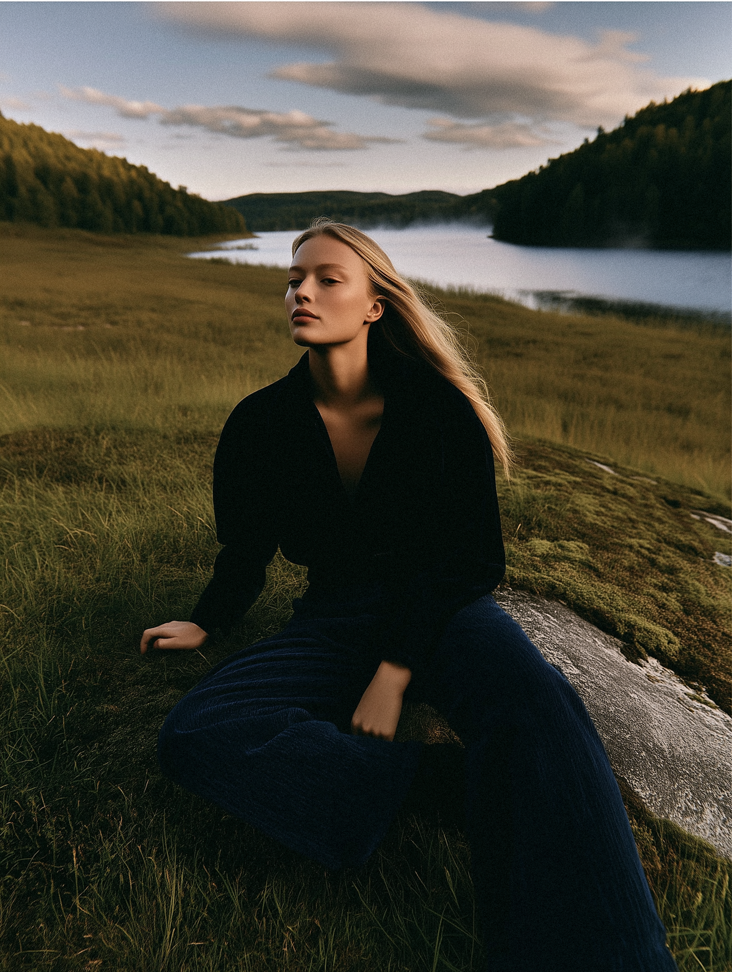 A serene portrait of a woman in nature, sitting by a lake with lush green hills and a tranquil sky in the background.
