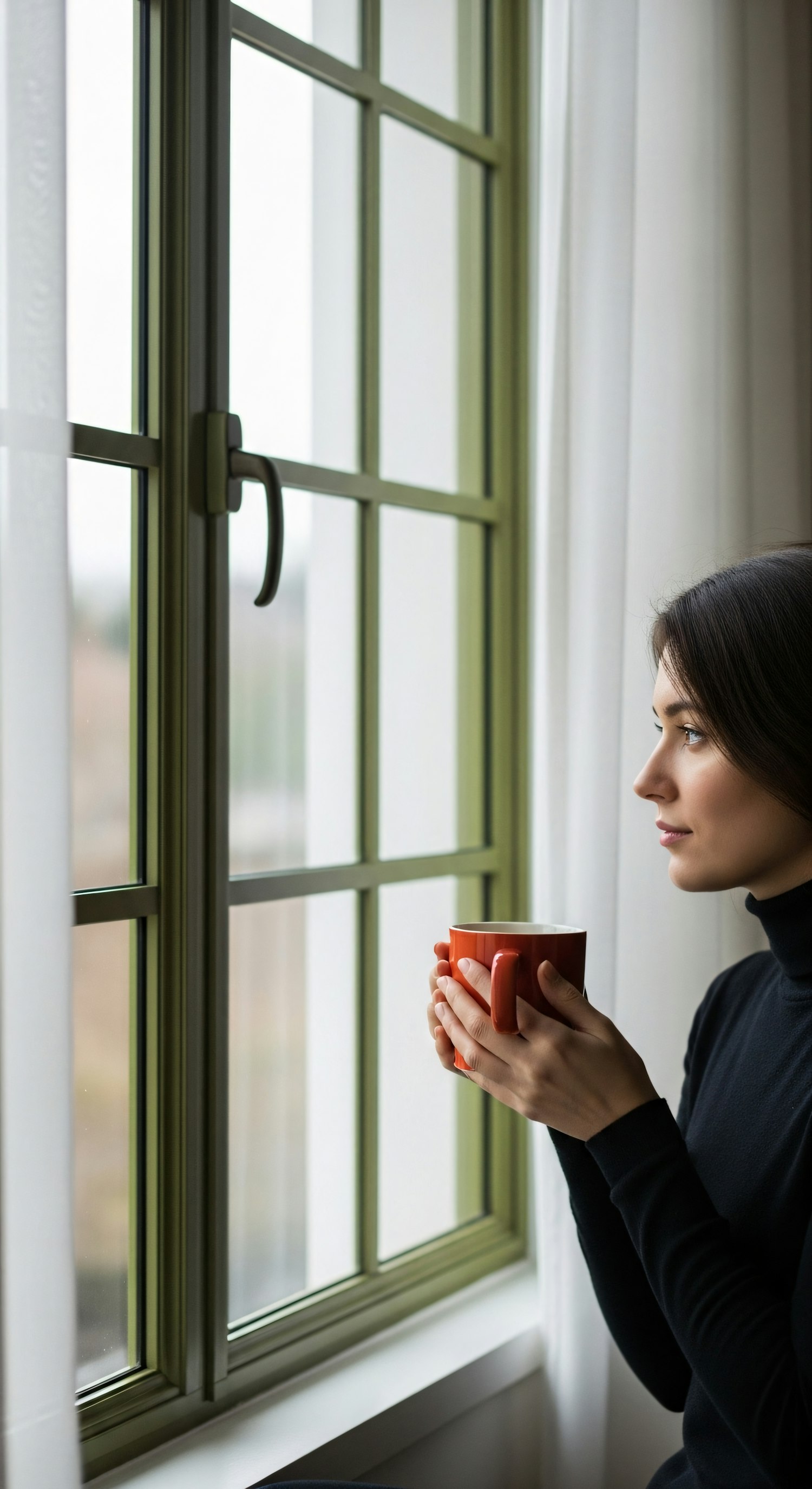 A woman in a black turtleneck holds a red mug, gazing out a green-framed window with white curtains, creating a serene and reflective vibe.