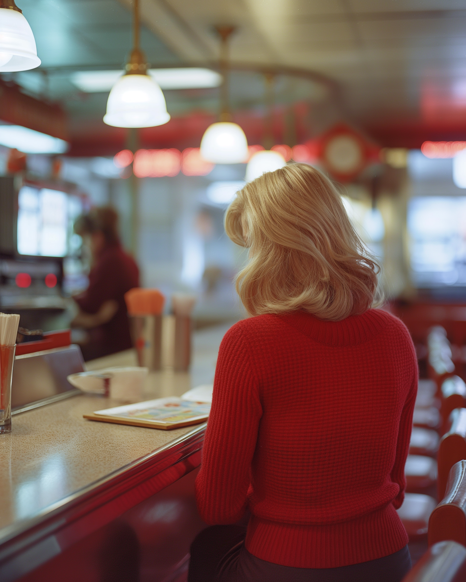 Blonde woman in red sweater at retro diner counter, reading menu. Warm, nostalgic atmosphere with classic decor and soft lighting.