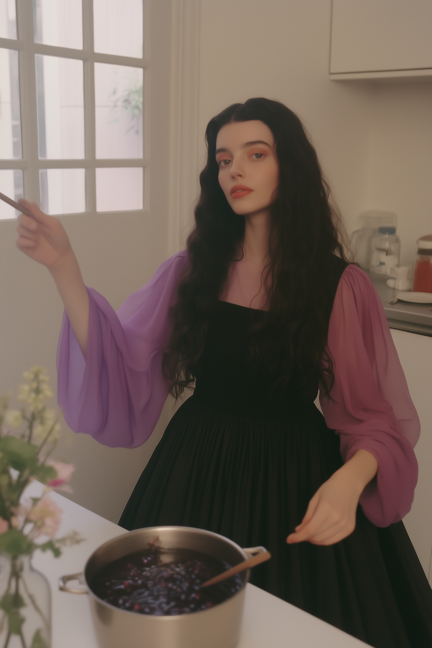 Young woman in a kitchen stirring a pot with berries, wearing a black dress with purple sleeves. Soft lighting and floral decor.