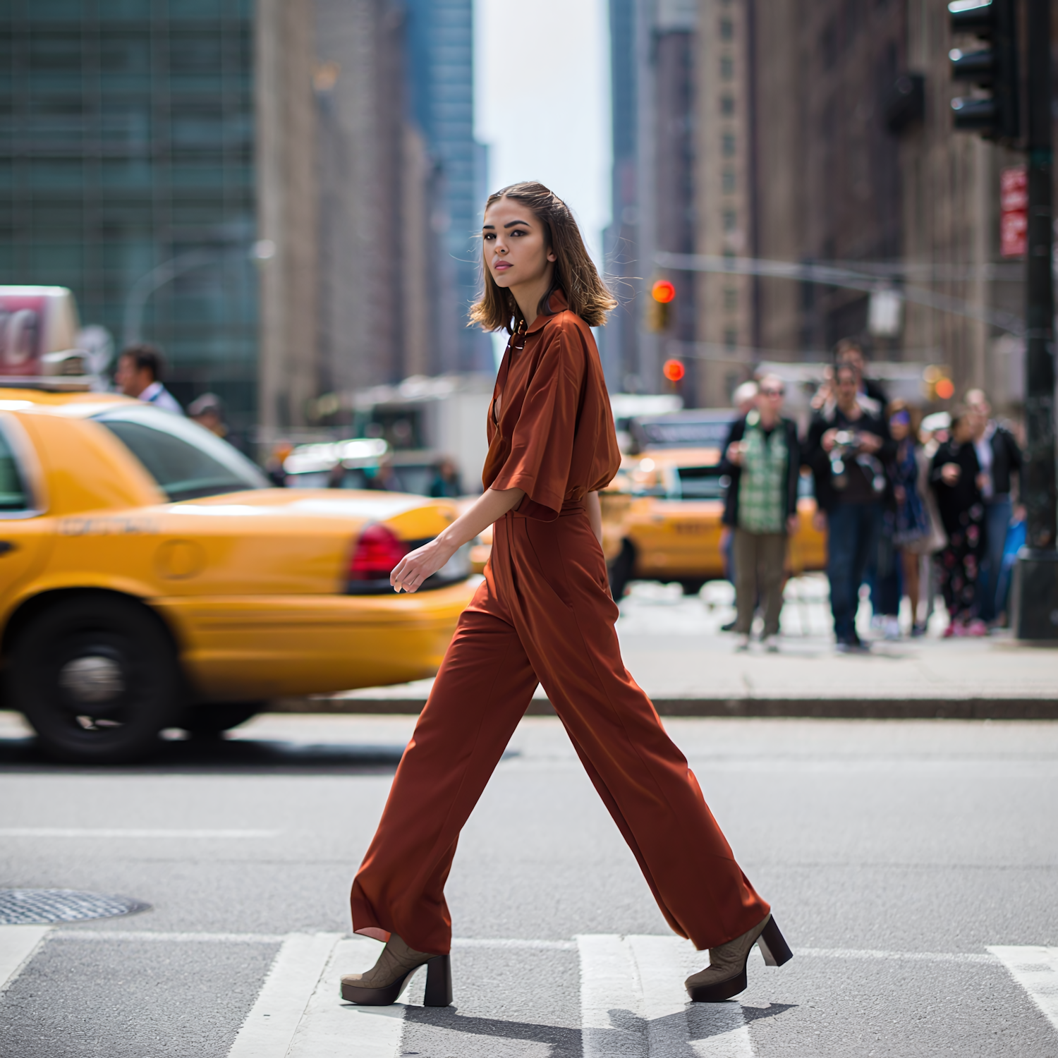 Stylish woman in a rust jumpsuit crossing a busy city street with yellow taxis and urban buildings in the background.