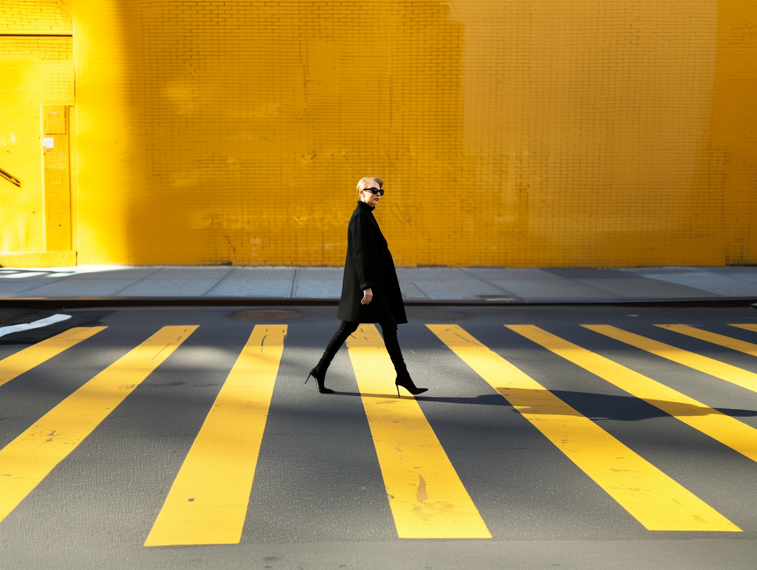 Stylish individual in black coat and heels crossing a street with bold yellow lines against a vibrant yellow wall.