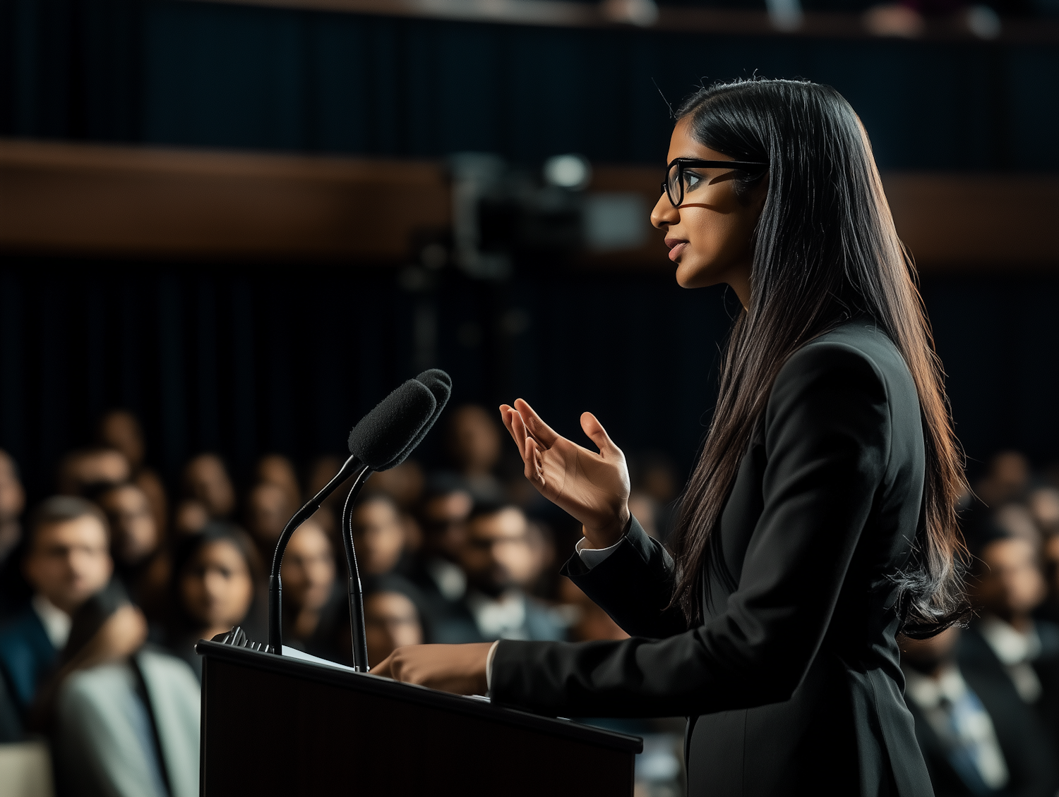 Confident woman in a black suit speaks at a podium, engaging a large audience at a formal event or conference.