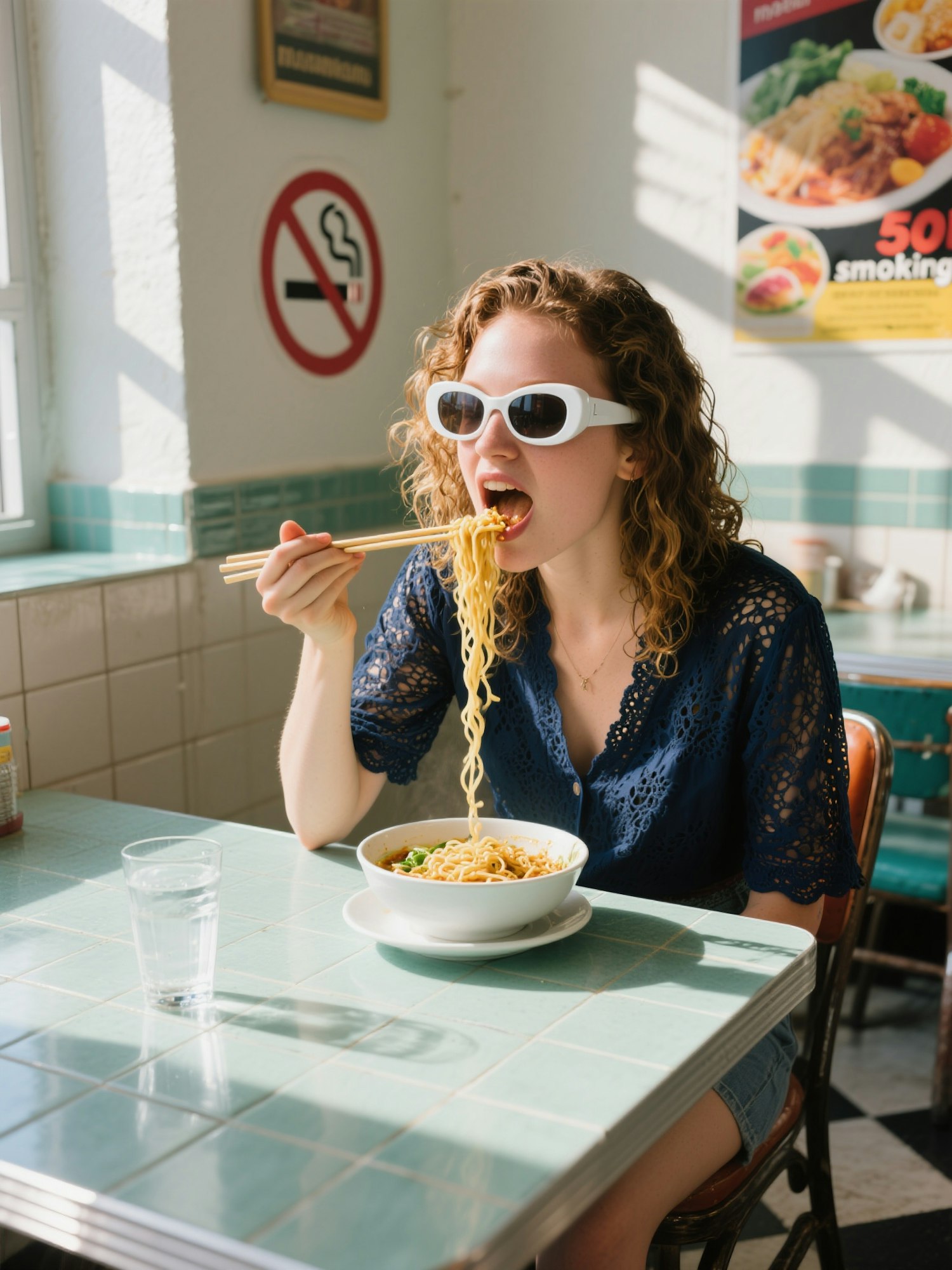 sunny lifestyle photo, candid moment, strong natural lighting, clear shadows, vibrant colors, soft textures, shallow depth of field, casual framing, summer energy, editorial feel, a young woman with wet curly hair eating noodles with chopsticks in a vintage tiled restaurant, wearing futuristic white sunglasses and a navy openwork blouse, slurping noodles with exaggerated posture, “no smoking” sign and food poster on the wall, high-flash effect