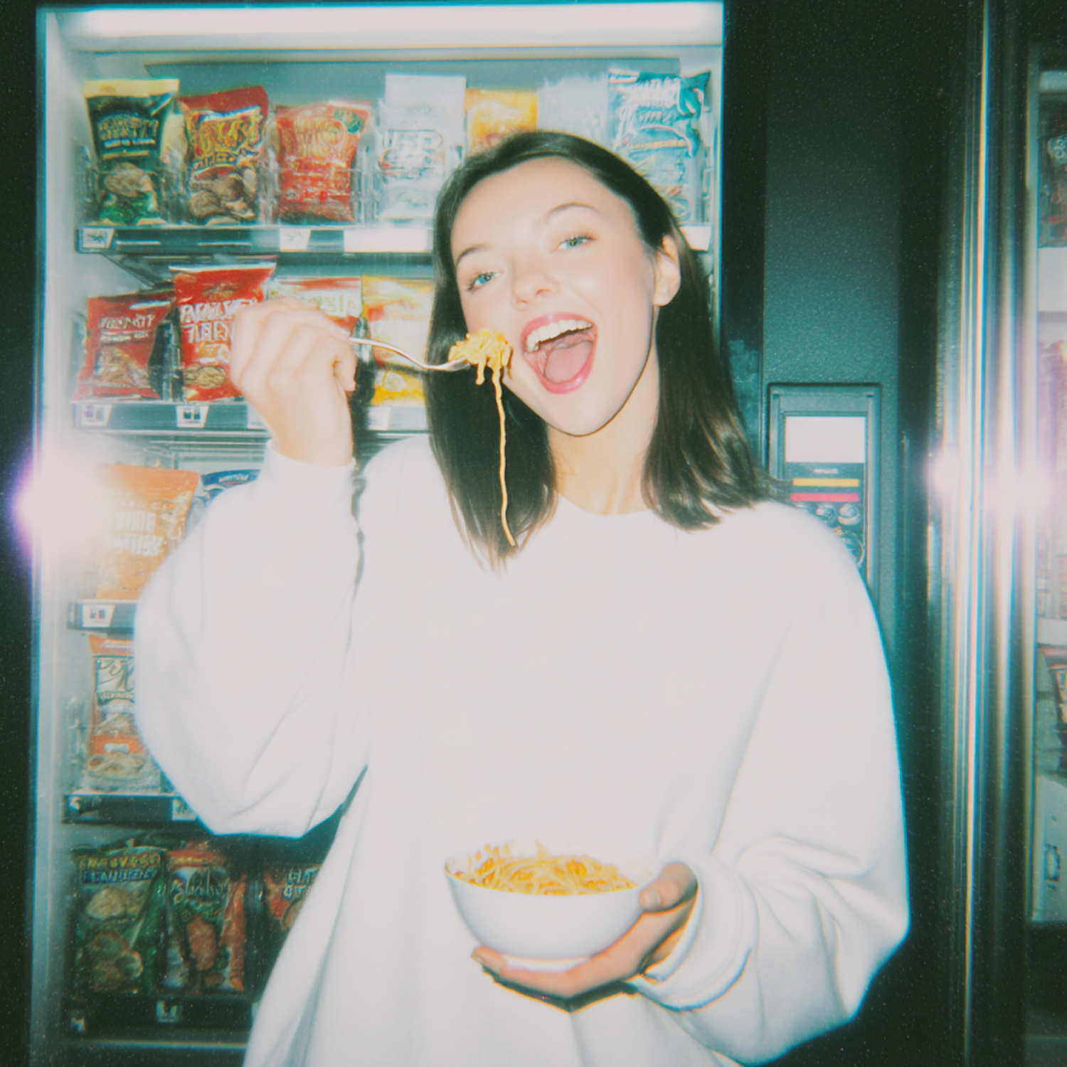 A cheerful woman in a white sweatshirt enjoys noodles in front of a vending machine filled with colorful snacks. Retro vibes!