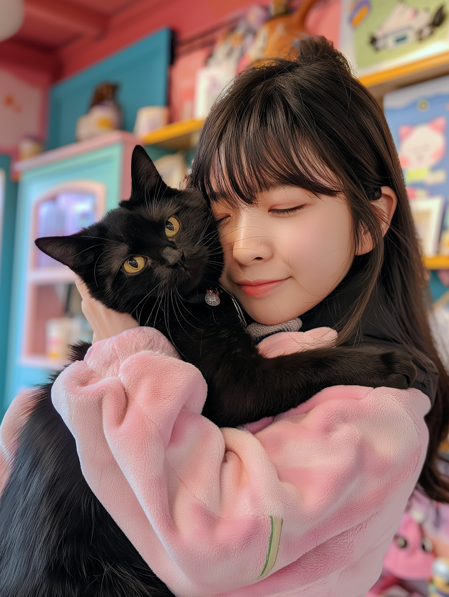 Asian woman in pink sweater cuddles a black cat with yellow eyes in a colorful, cozy room. Both appear content and relaxed.