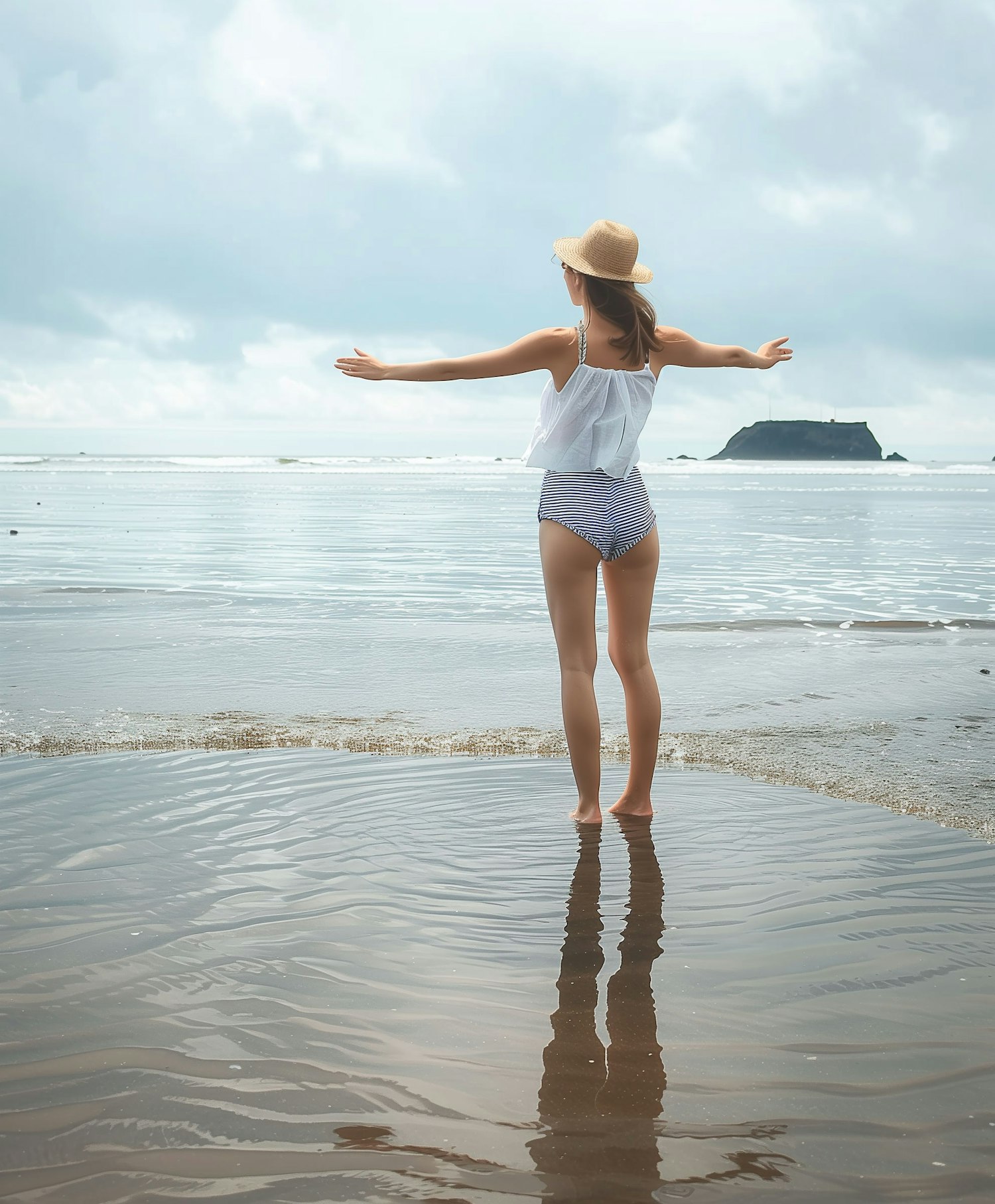 Woman in straw hat and summer outfit stands on a beach, arms outstretched, facing the sea with an island in the distance.