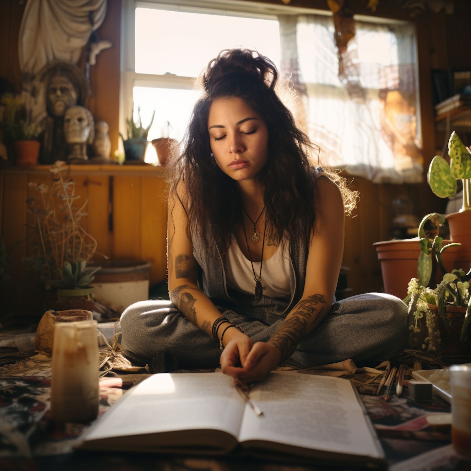 Young woman with tattoos reads in a sunlit room filled with plants and art, creating a warm, introspective atmosphere.