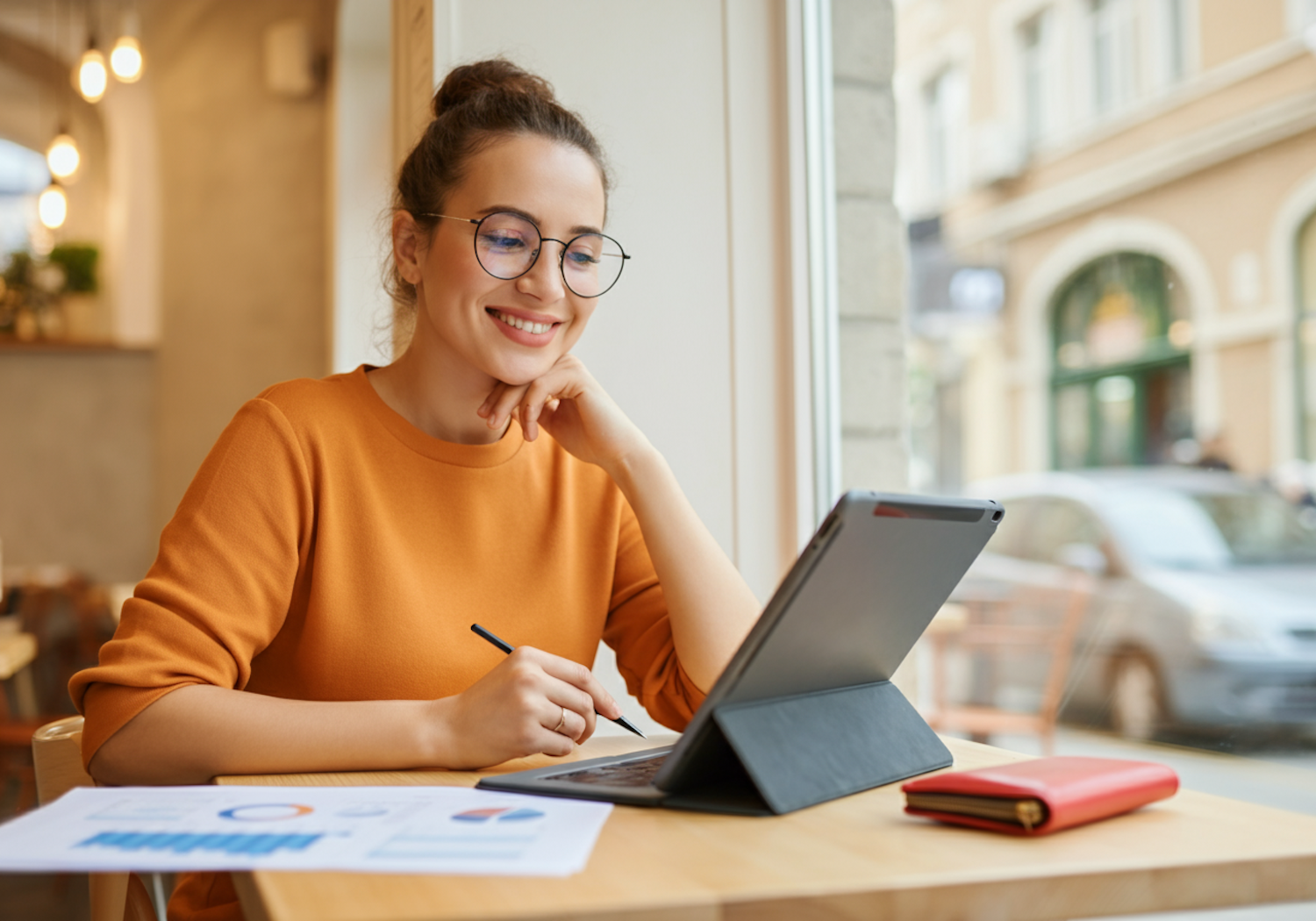 Young woman in orange sweater working on a tablet in a cafe, with charts and a red notebook on the table.