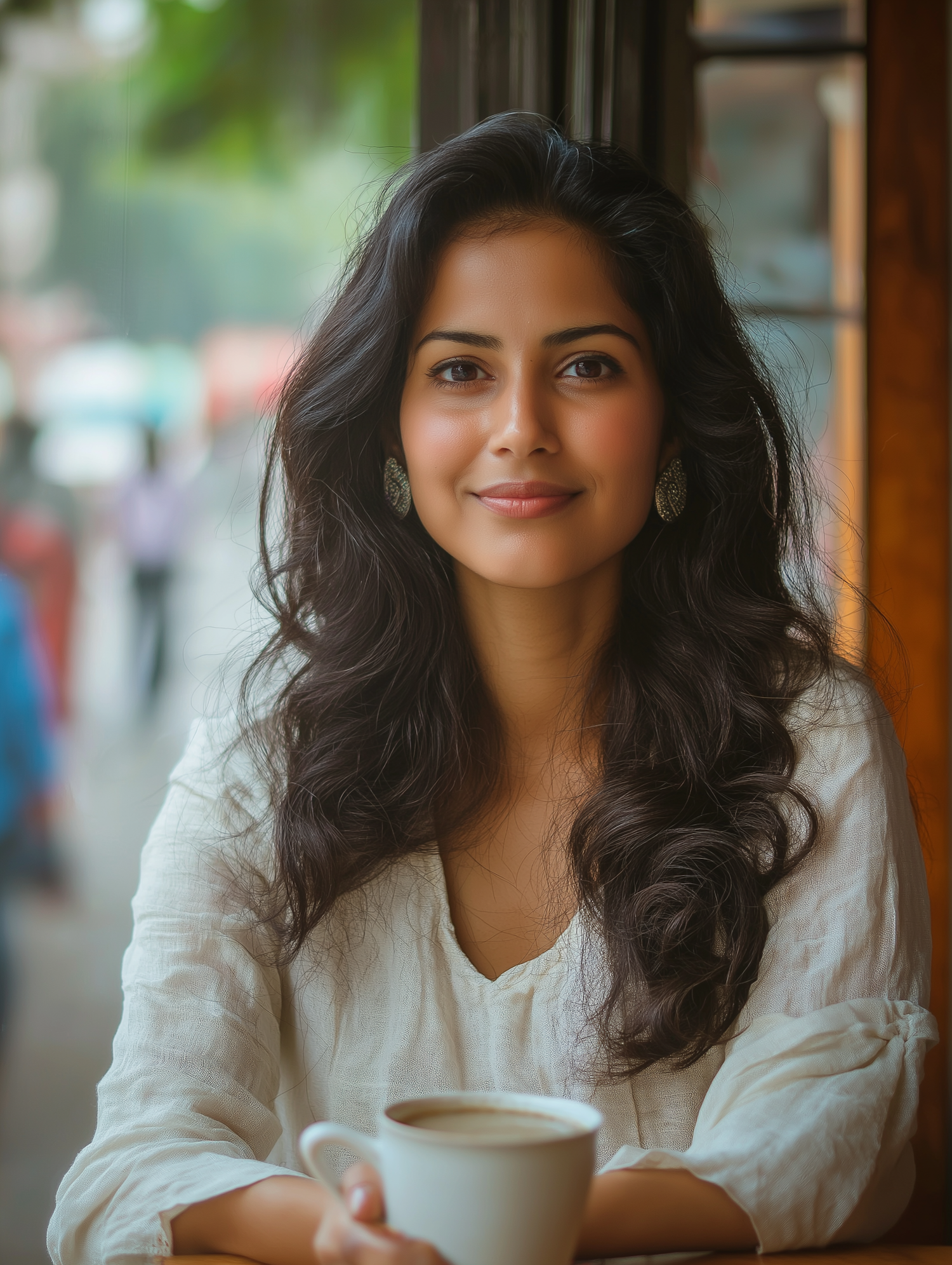 Woman with wavy black hair and white blouse enjoying coffee indoors, with a blurred street view in the background.