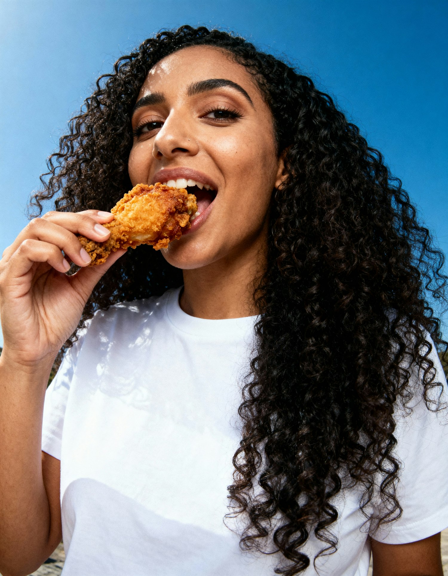 A woman with curly hair enjoys a crispy fried chicken drumstick under a clear blue sky, wearing a white t-shirt and smiling.