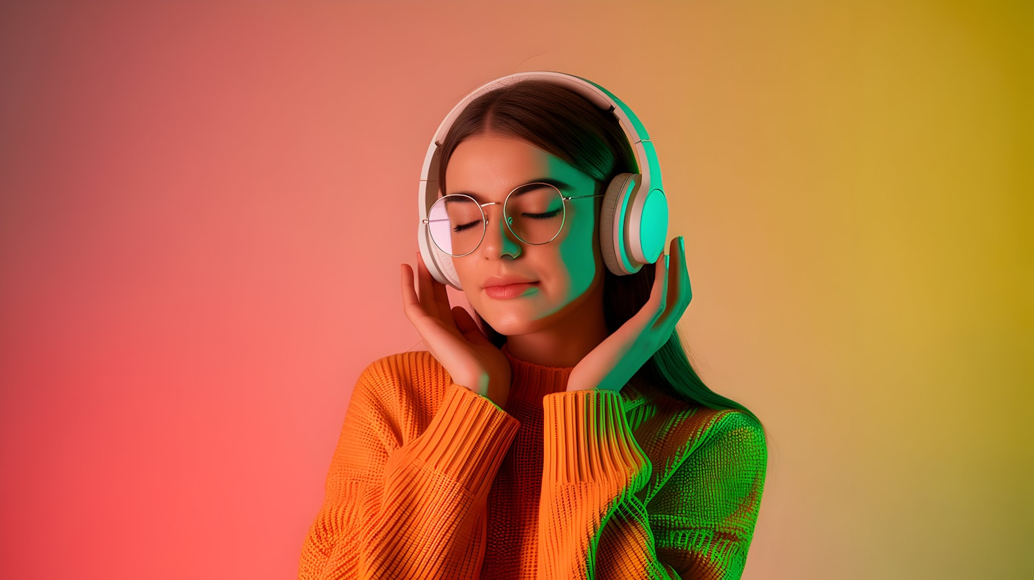 A serene woman in an orange sweater enjoys music with white headphones, set against a warm gradient background with green lighting.