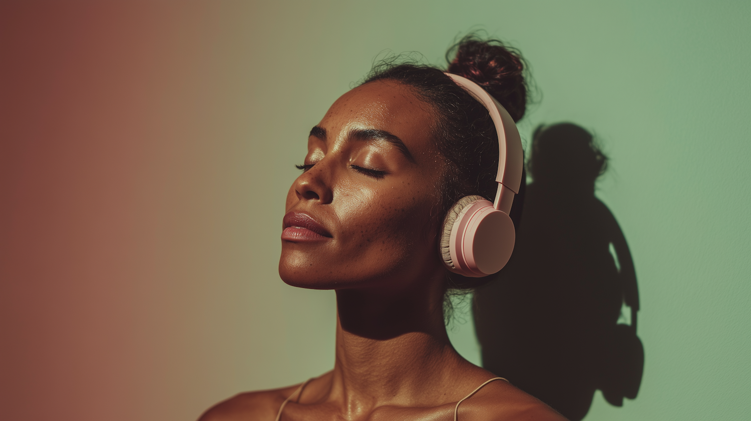 A serene woman with headphones enjoys music against a gradient background, blending warm and cool tones for a calming aesthetic.