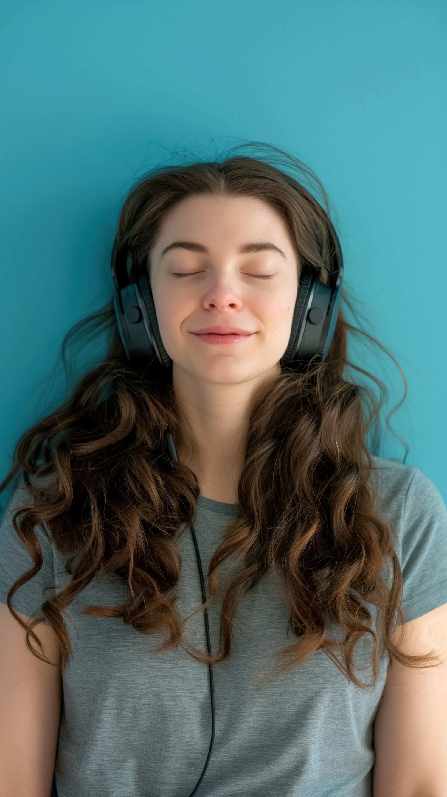 Young woman with headphones, eyes closed, enjoying music against a teal background. Relaxed and serene expression.
