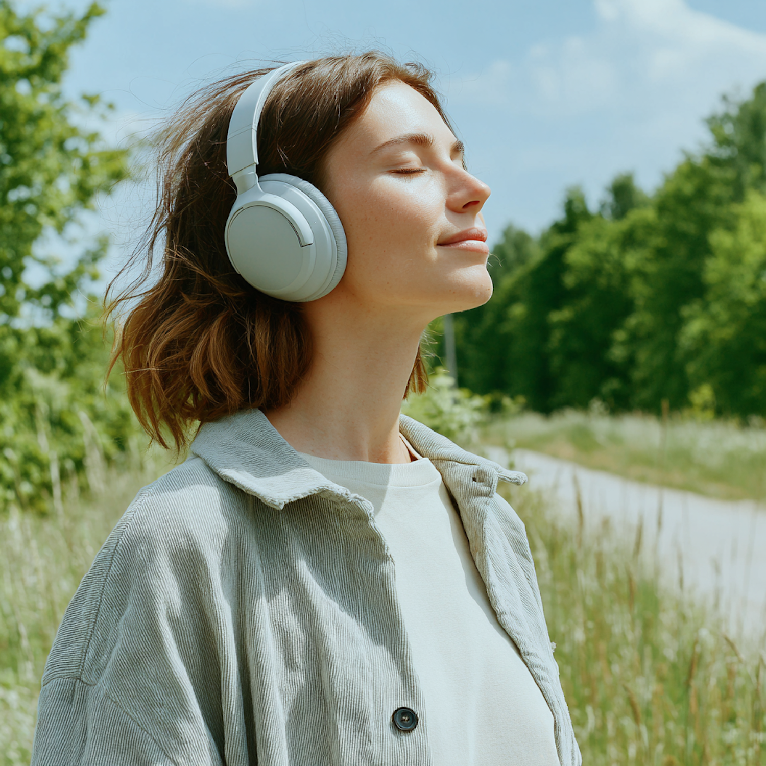 Woman enjoying music outdoors with white headphones, eyes closed, surrounded by greenery and a sunny sky.