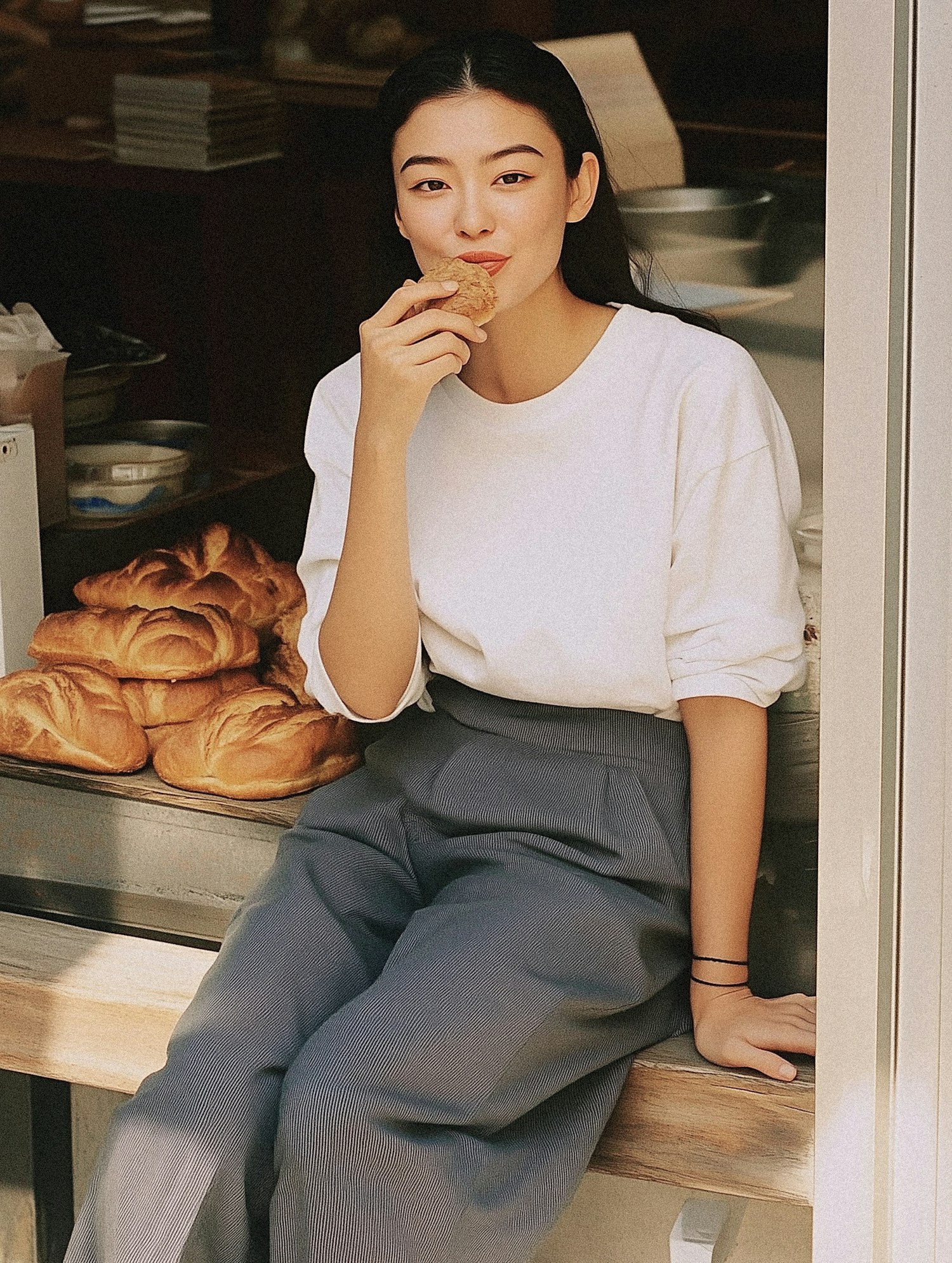 Asian woman enjoying a pastry in a cozy bakery setting, wearing a white shirt and gray pants, surrounded by fresh bread.