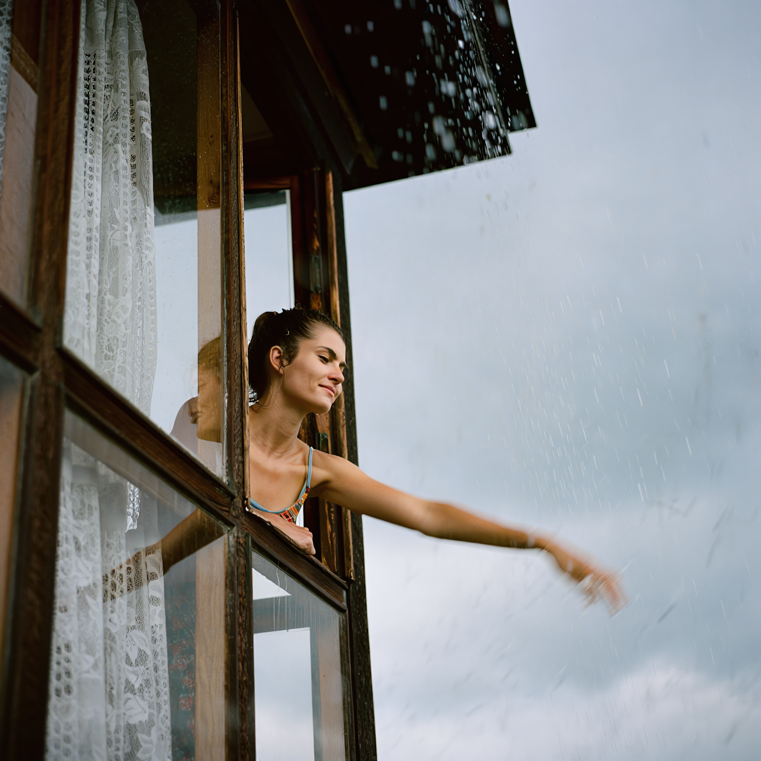 A woman leans out of a wooden window, enjoying the rain with a smile. Lace curtains and a cloudy sky add charm to the scene.
