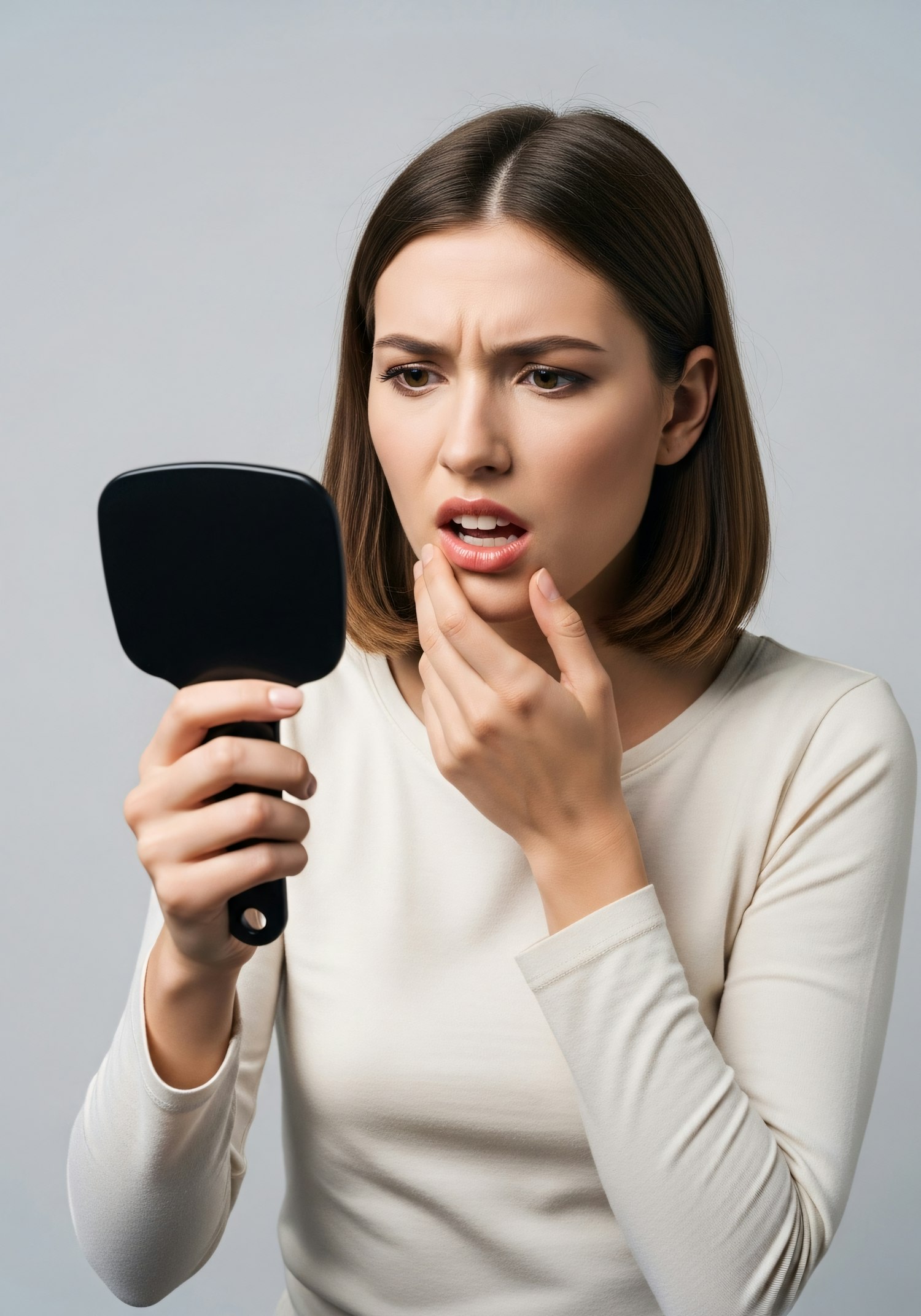 A young woman examines her face in a handheld mirror with a concerned expression, wearing a beige shirt against a neutral background.