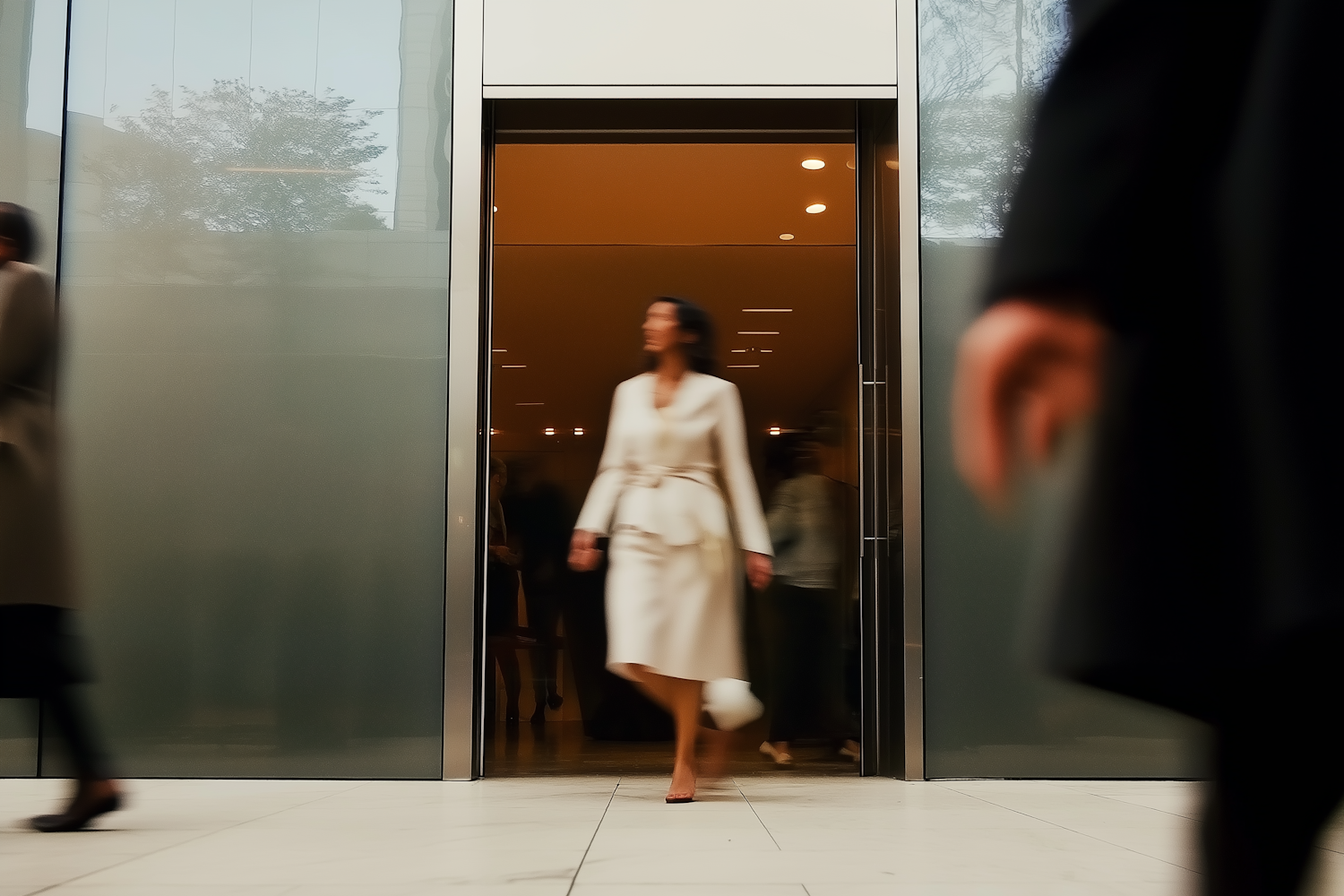 Blurred motion of a woman in a white suit exiting a modern glass building, capturing a dynamic urban scene.