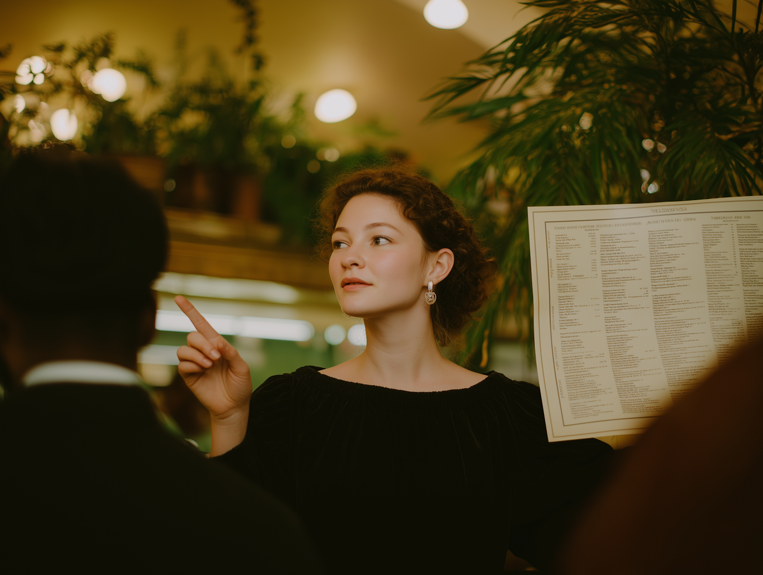 A woman in a warm-lit setting holds a menu and gestures, possibly explaining something, with plants and soft lighting in the background.