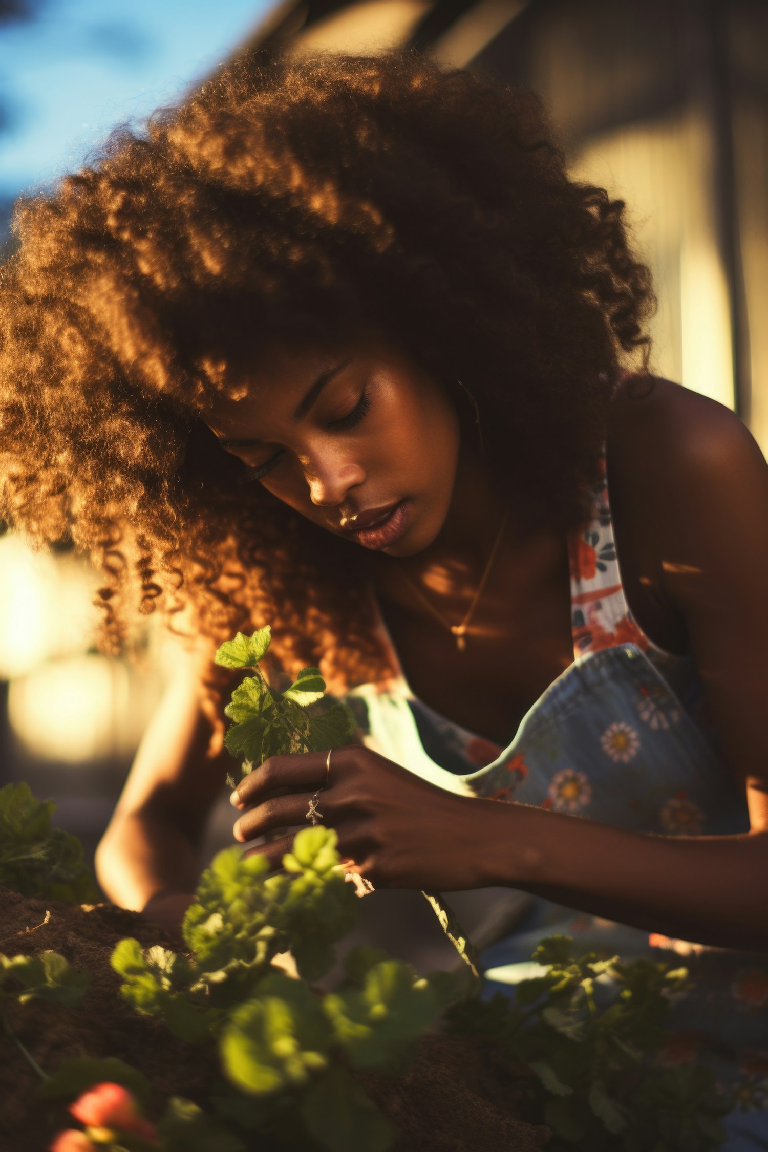 A serene moment of a woman with curly hair gardening during golden hour, wearing a floral dress and bathed in warm sunlight.