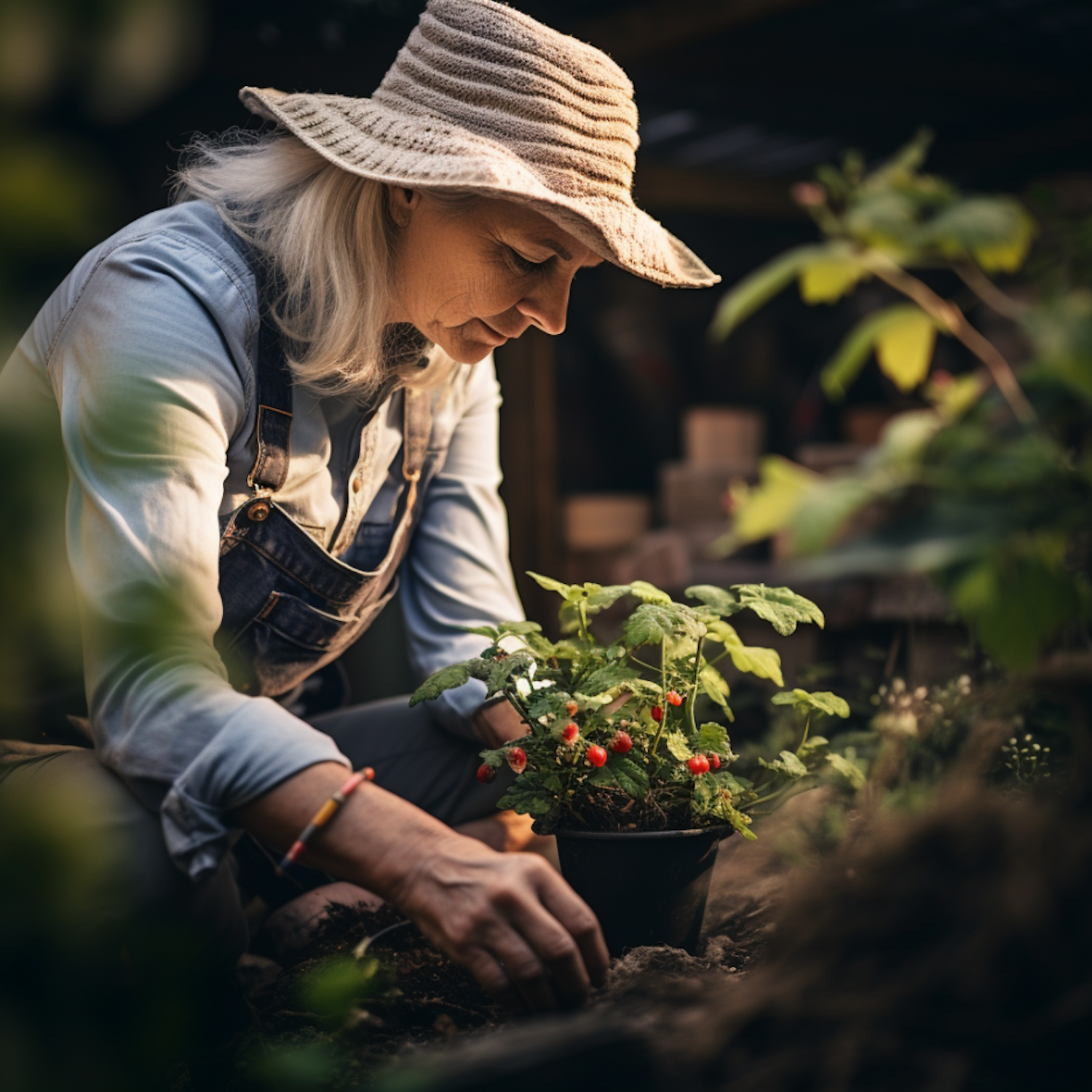Woman in straw hat and overalls gardening, planting a potted plant with red berries in a sunlit garden.