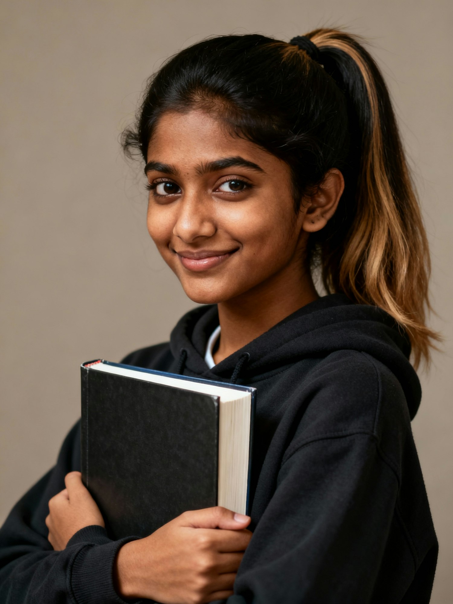 Studio portrait of a South Asian female high-school student; warm medium-brown skin; dark hair pulled into a high ponytail with light caramel highlights; casual hoodie; neutral seamless backdrop; Rembrandt lighting; 105 mm macro-sharp; photorealistic. She carries two textbooks. Expression: friendly, studious. Negative: glam retouch, over-bright colors.