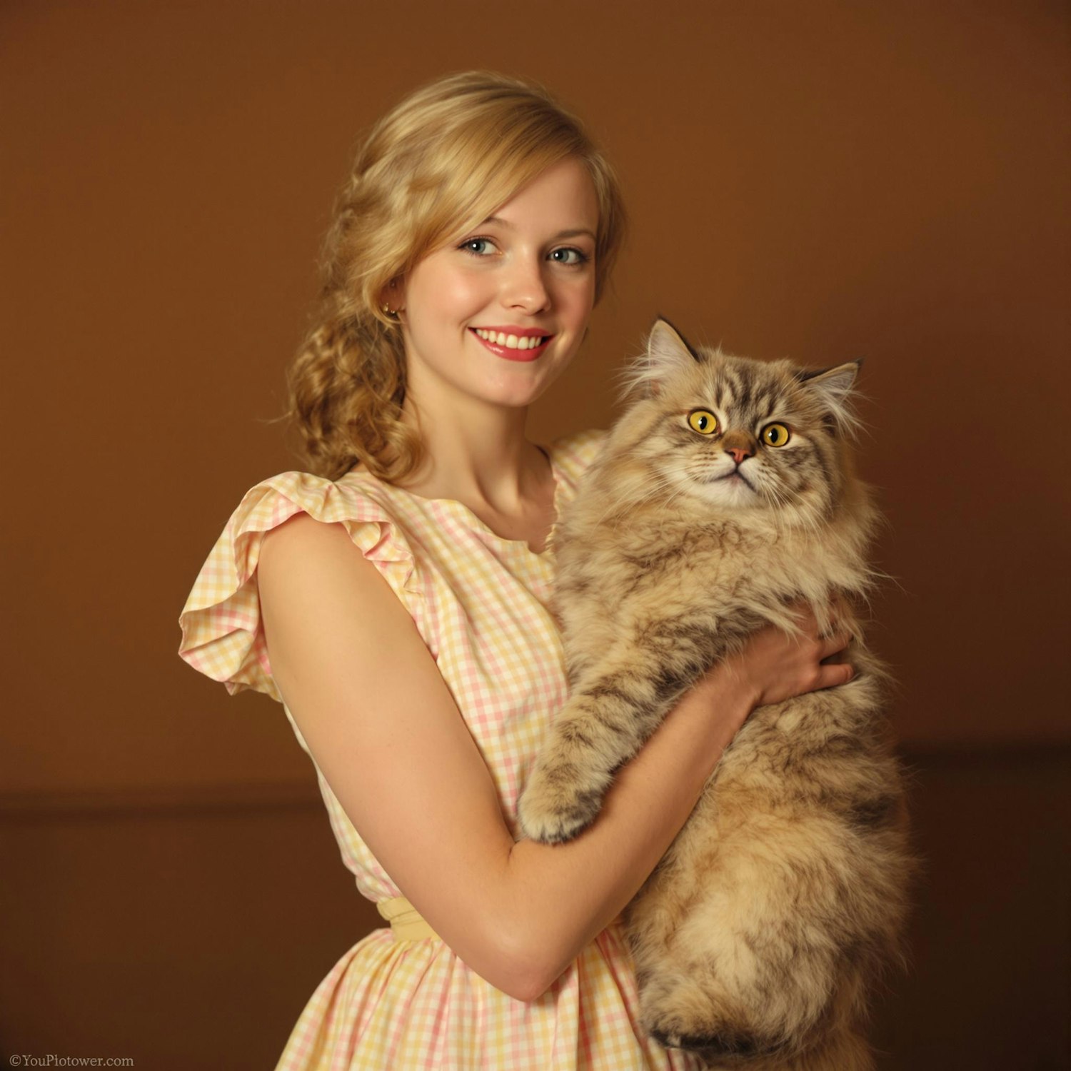 Blonde woman in a gingham dress holding a fluffy cat with striking yellow eyes against a warm brown background.