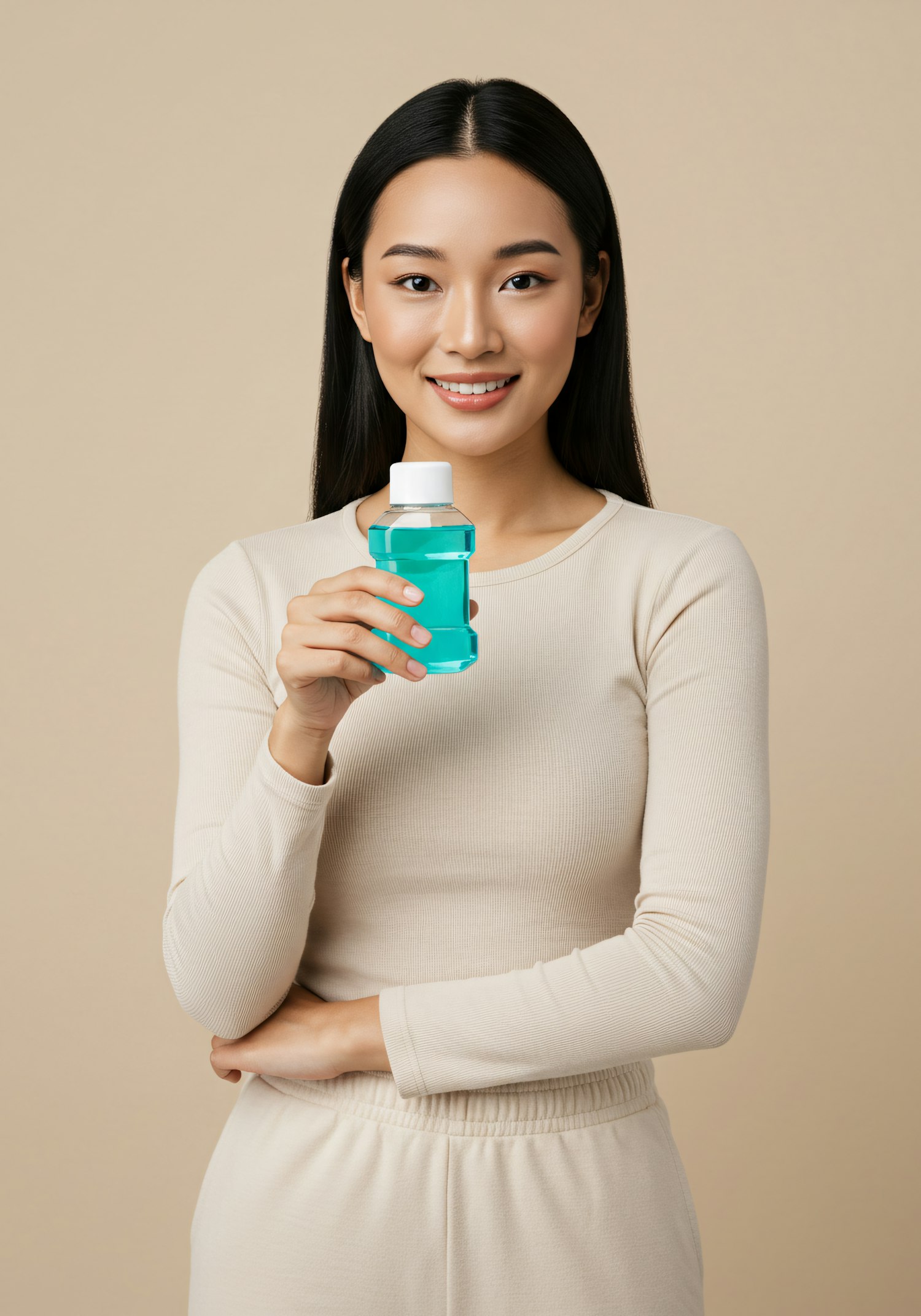 A woman in a beige outfit holds a bottle of blue liquid, smiling warmly against a neutral background.