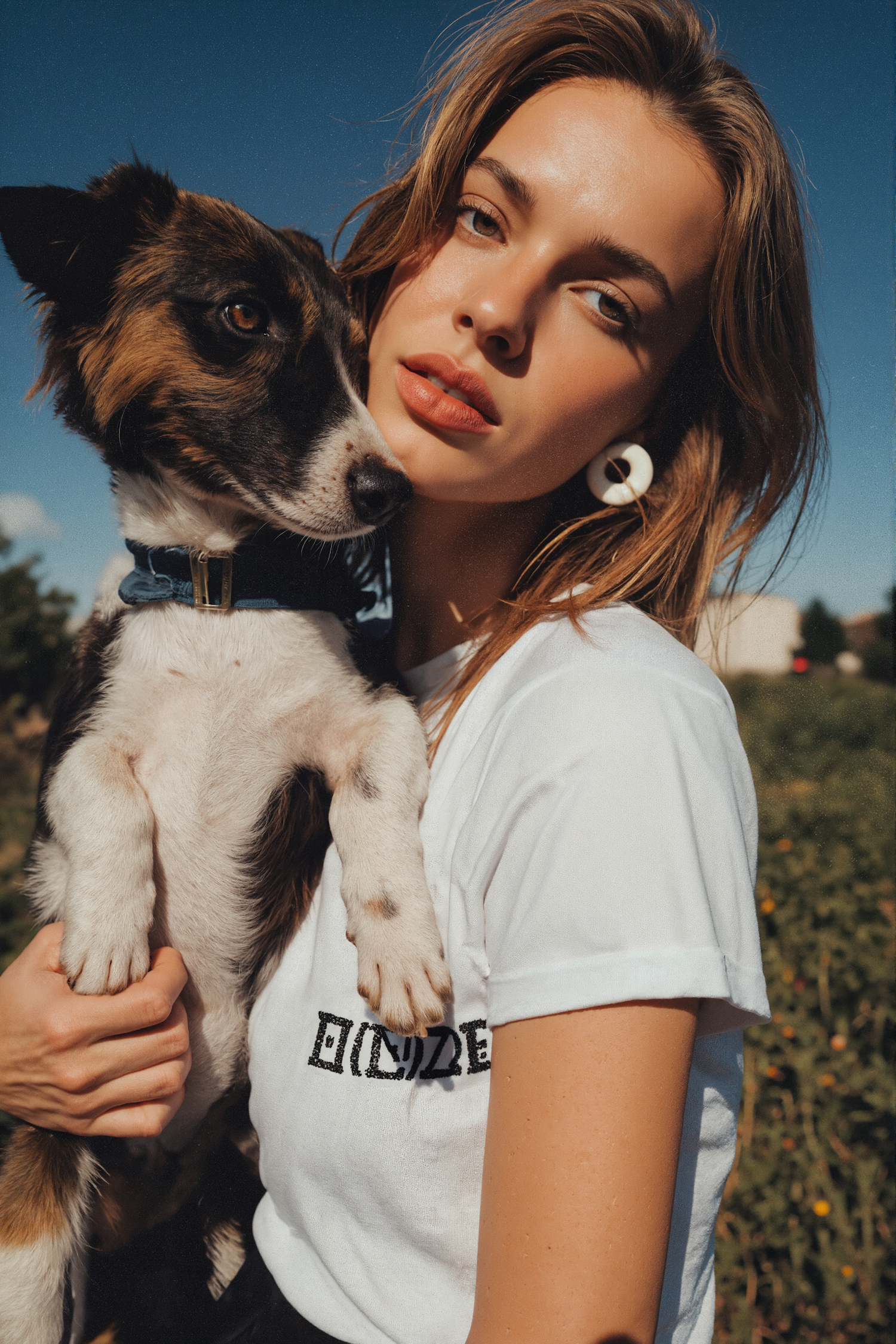 A young woman with light brown hair and a tricolor dog enjoy a sunny day outdoors, posing against a clear blue sky and greenery.