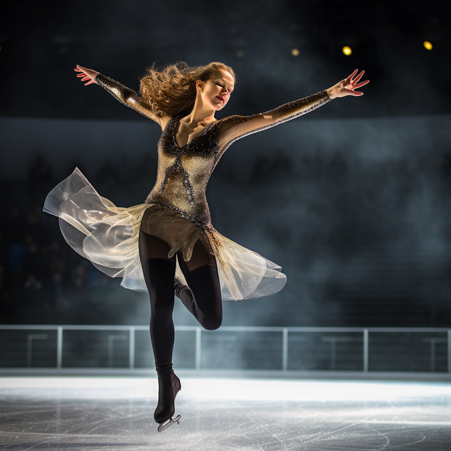 A graceful figure skater in a shimmering costume performs a jump on the ice, captured in dramatic lighting.