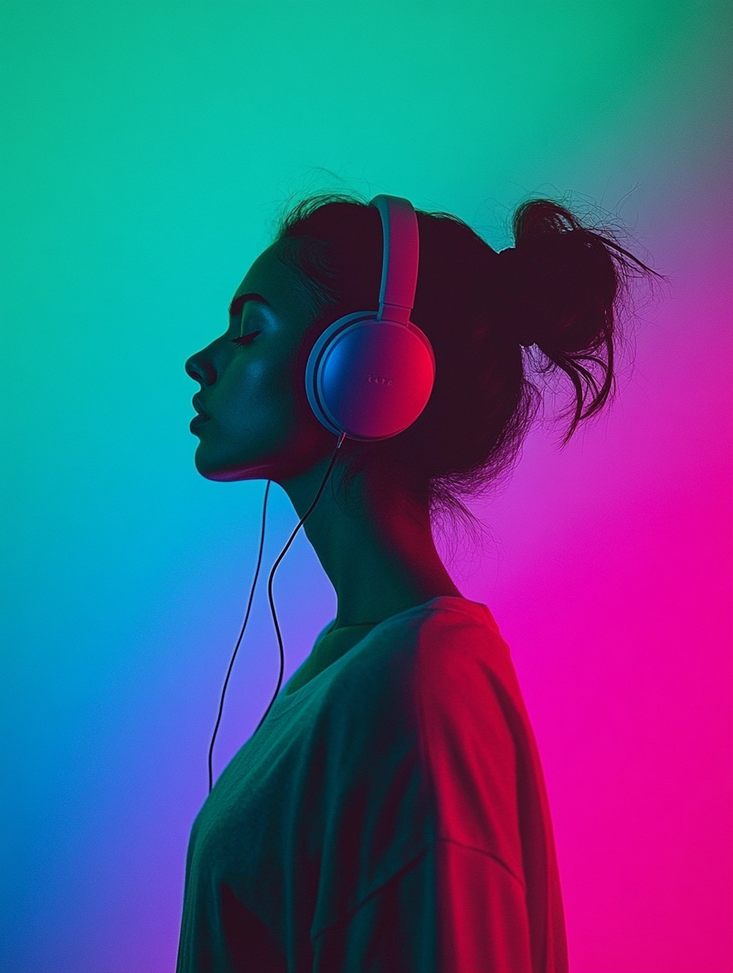 A serene profile of a woman with headphones, set against a vibrant teal and pink gradient background, enjoying music in a calm moment.